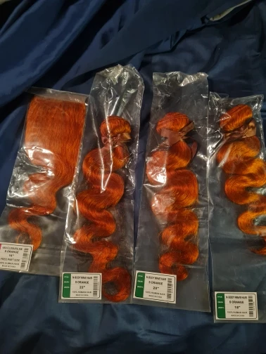 Я люблю волосы, поставщика и общение. Я заказал 26 ”* 4 и 4 на 4 закрытия. Я получил 28 ”4 упаковки и 4by4 закрытие. Постирайте фиолетовый шампунь, чтобы цвет был оранжевым. После холодной стирки с шампунем, он хорошо осел. Не линяет, но ожидает, что небольшое количество прядей упадет, это нормально, даже наши натуральные волосы также падают. Я получил много положительных комментариев, когда надел волосы на мероприятие. Я буду заказывать больше у поставщика.