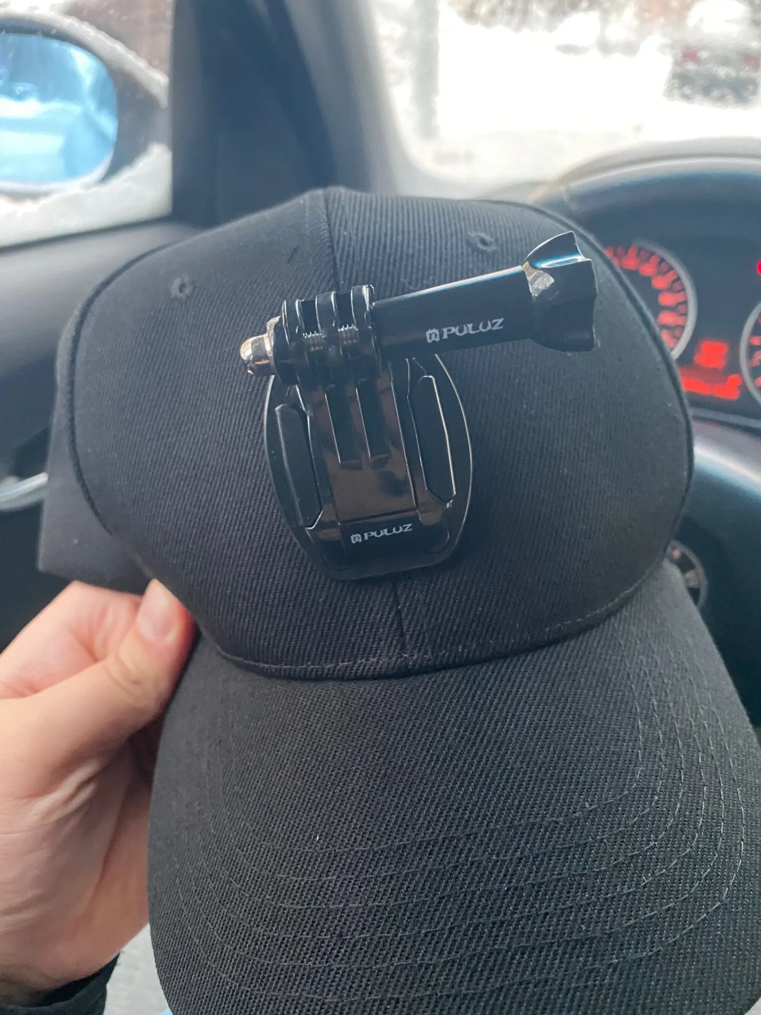 Кепка с держателем, выглядит странно но все нормас. Регулируется лентой липучкой