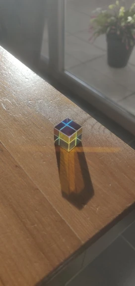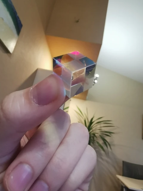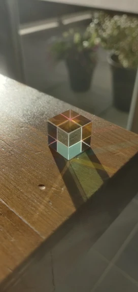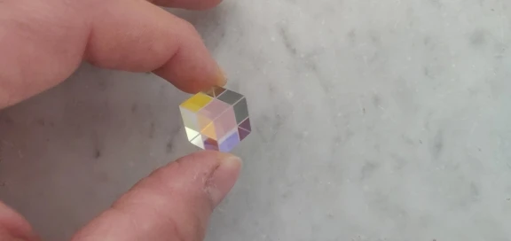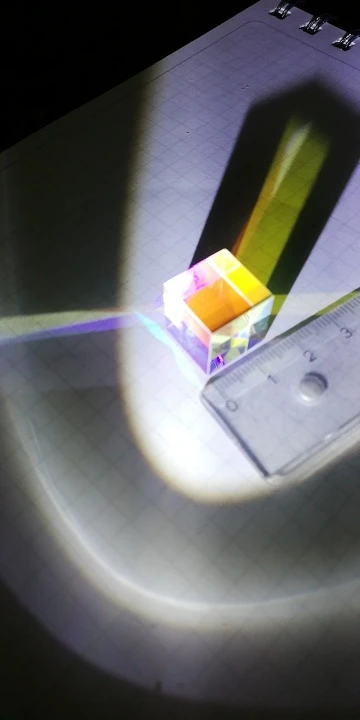 Очень интересный куб, заказывали ещё другие виды призм, но этот впечатлил больше всего. Видимо в нём есть какое-то напыление. Смотрится очень эффектно. Спасибо продавцу за качественный товар. Позже добавлю фото, но в живую эффект "вау" обеспечен.