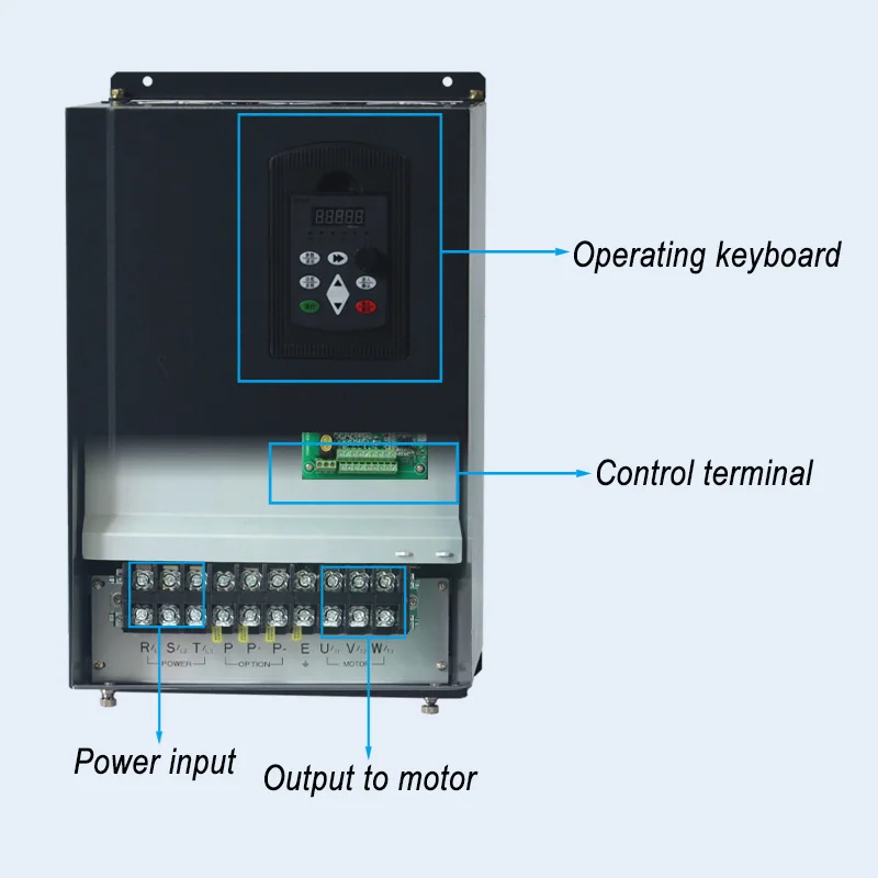 U, V, W являются выходными клеммами преобразователя частоты и подключен трехфазный асинхронный двигатель. P и P B являются соединительными клеммами тормозного сопротивления.