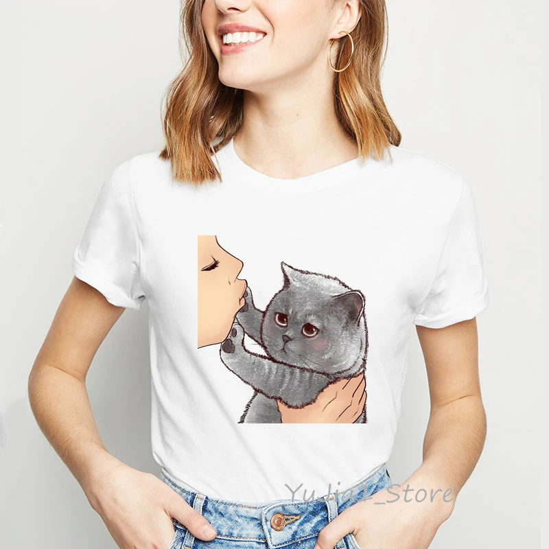 Забавные футболки с принтом кота no kiss, Футболка harajuku kawaii с животным принтом, летний топ, белая женская футболка, футболка в стиле 90-х, tumblr