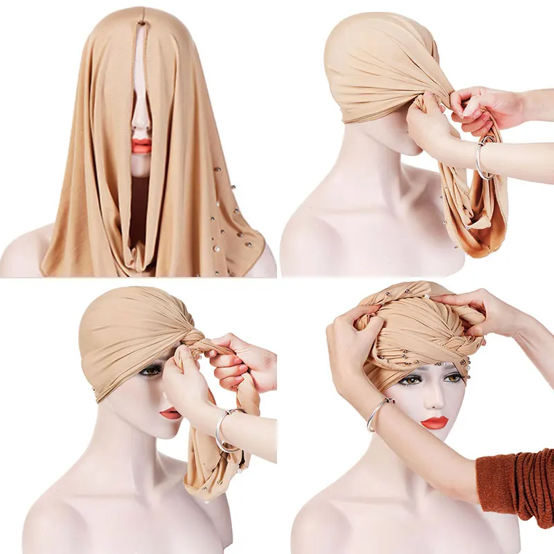Женский эластичный мусульманский Тюрбан Хиджаб с бусинами, шапки Хемо, Женский хиджаб, шарф, повязка на голову, мусульманский тюрбан с узлом, 2020