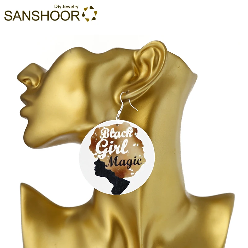 SANSHOORНовинка, 6 см, золотые чёрные волосы для девушек, волшебная женщина, с принтом, натуральные деревянные серьги-капли, черные женские художественные ювелирные изделия, 1 пара