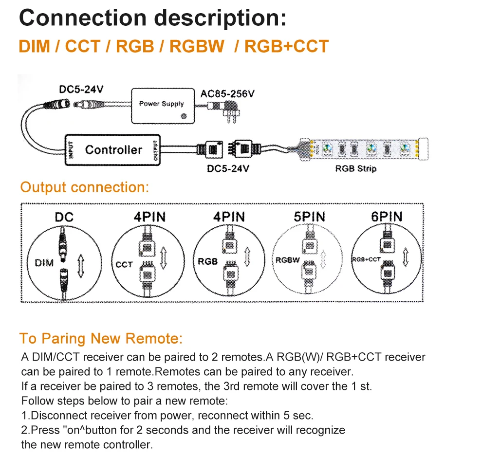 Технические характеристики изделия:Рабочая температура:-20-60 °Вход Напряжение: DC5-24VРежим подключения: общий анодСтатическая Потребляемая мощность: <0,5 ВтВыход ток:DIM-1CH * 6ACCT-2CH * 3ARgb-3ch * 2ARGBW-Max Toghther 6A,RGB + CCT-RGB 3 * 2A + CCT 2 * 2A Toghther 6A.