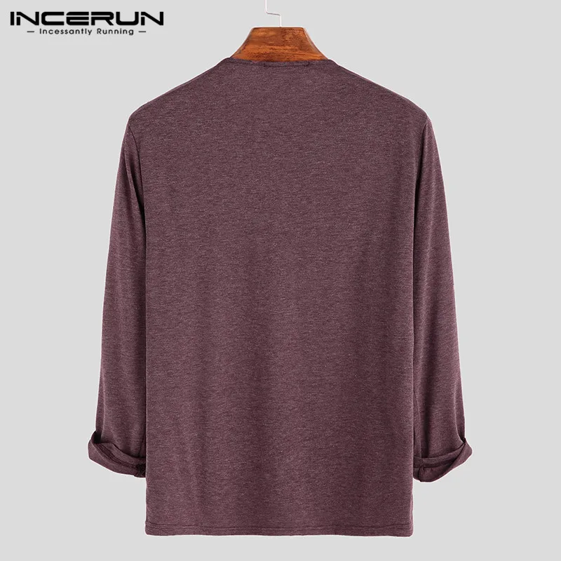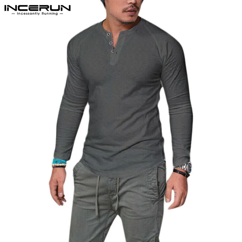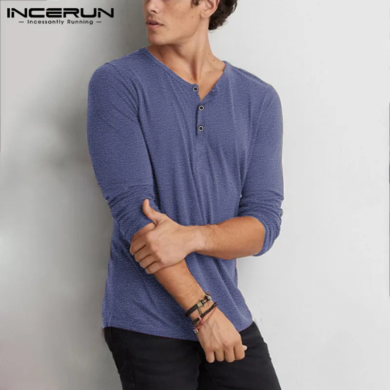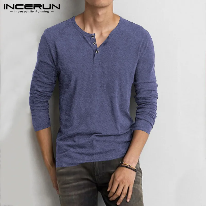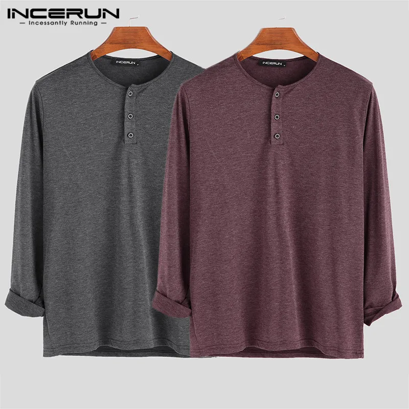 Мужская хлопковая футболка INCERUN, с длинным рукавом, круглым вырезом, однотонная, на пуговицах, повседневная, 2021