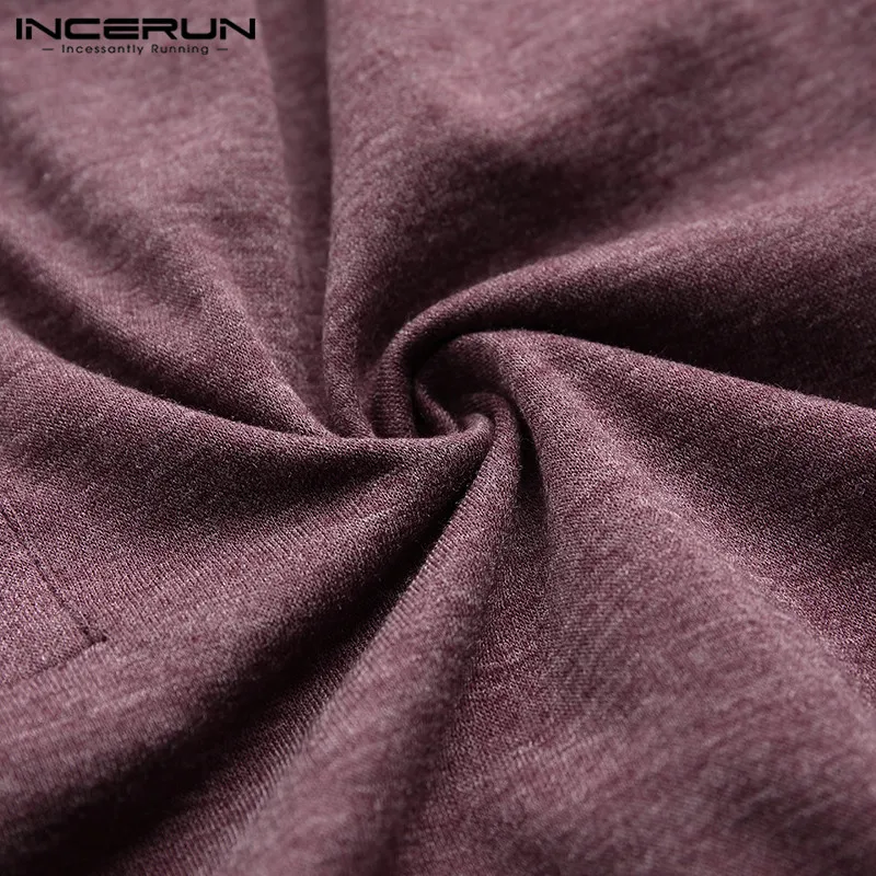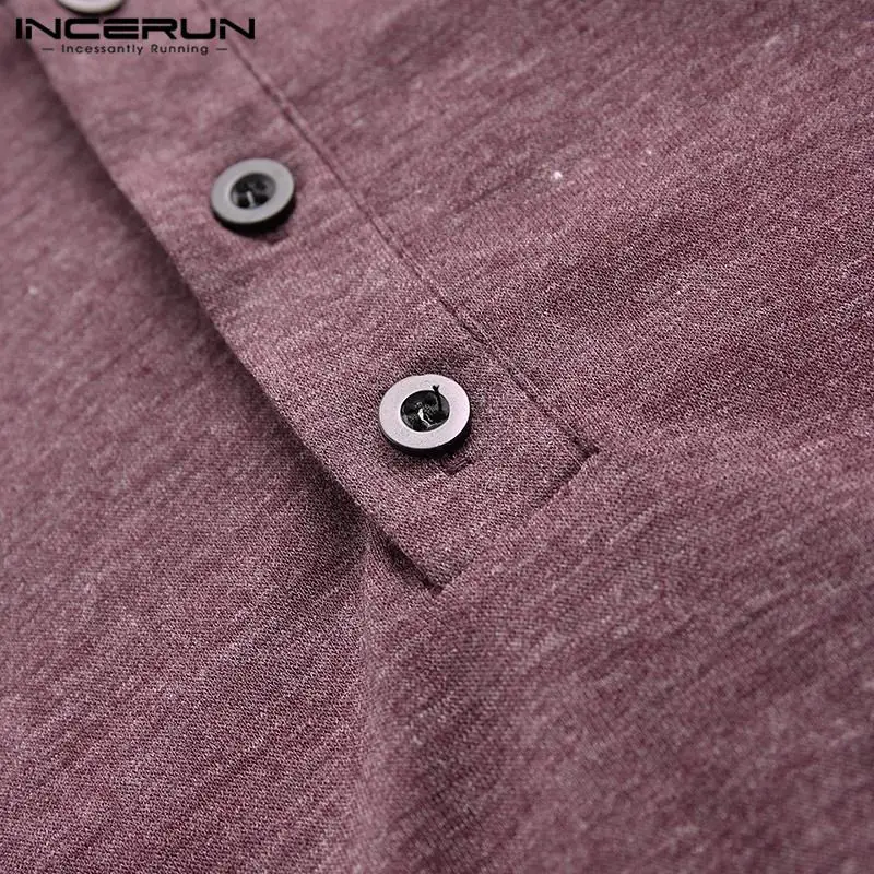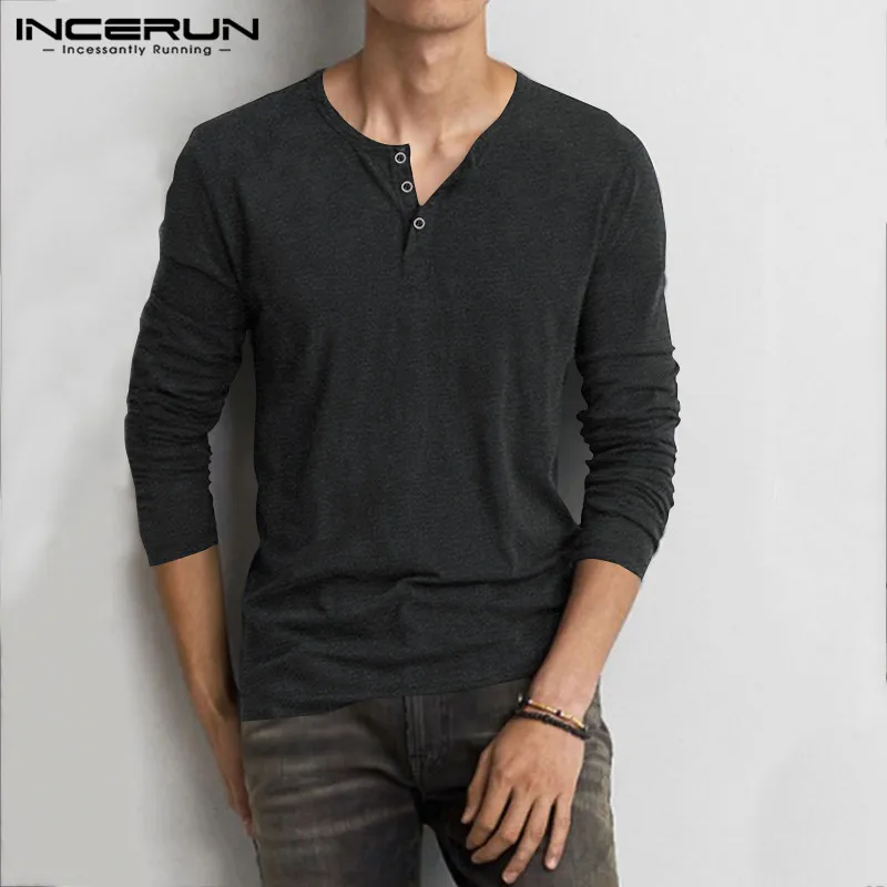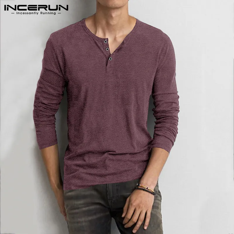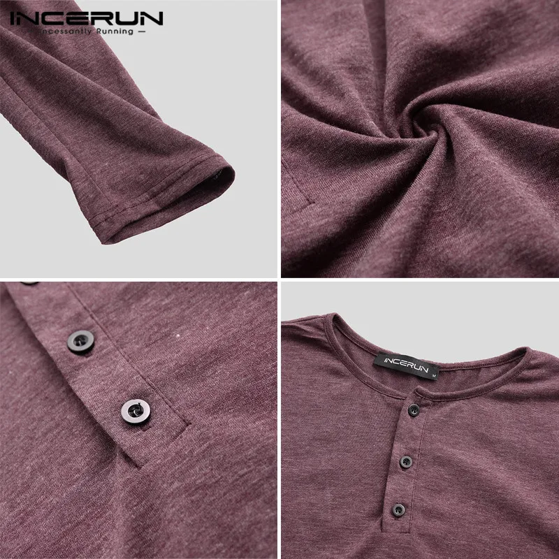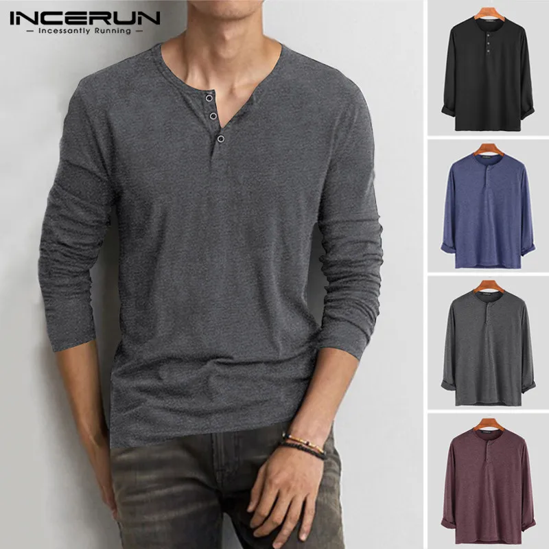 Мужская хлопковая футболка INCERUN, с длинным рукавом, круглым вырезом, однотонная, на пуговицах, повседневная, 2021