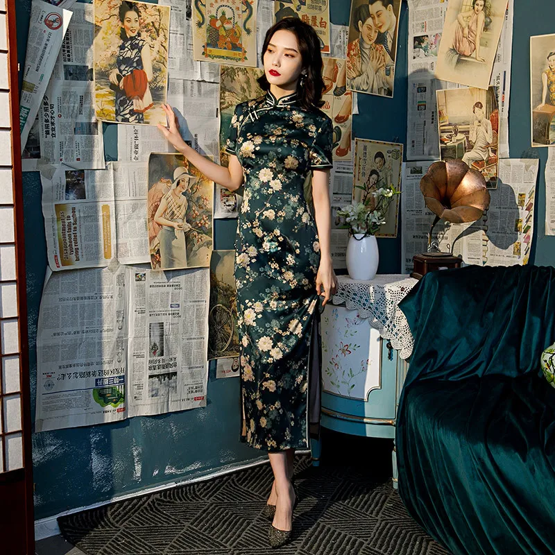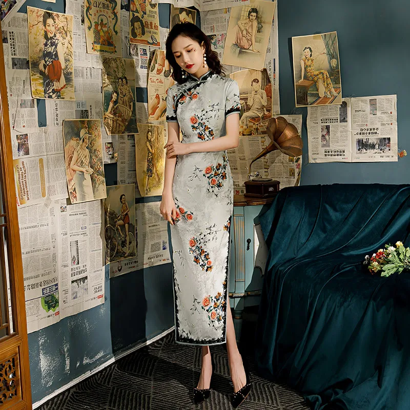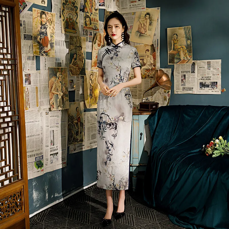 Платье-Ципао женское атласное, серое, большого размера, 3XL, 4XL, с коротким рукавом, с цветочным принтом
