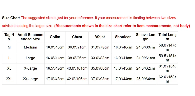Размер на бирке. Взрослый рекомендуется Размеры Воротник-стойка Обхват груди Обхват талии Сумка на плечо Рукав Длина В общей сложности Длина М Средний размер 16,0 "/40 см 36,0 "/91 см 31,0 "/78 см 16,0 "/40 см 24,0 "/60 см 58,0 "/147 см L Большой 16,0 "/41 см 38,0 "/96 см 33,0 "/83 см 16,0 "/41 см 24,0 "/61 см 59,5 "/151 см XL X-большой 16,5 "/42 см 40,0 "/101 см 35,0 "/88 см 17,0 "/43 см для ухода за ребенком для мам 24,5 "/62 см 61,0 "/154 см 2XL 2X-Large 17,0 "/43 см для ухода за ребенком для мам 42,0 "/106 см 37,0 "/93 см 17,0 "/44 см 25,0 "/64 см 62,0 "/158 смПолезные советы: Замеры делаются вручную, поэтому учитывайте небольшие погрешности. Цвет на фото может немного отличаться от реального товара из-за особенностей цветопередачи различных мониторов.
