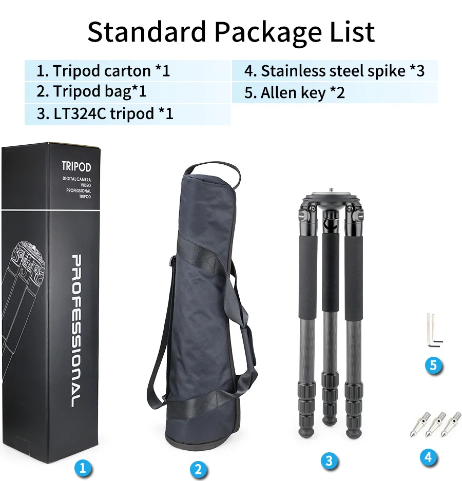 В посылка входит чехол для штатива, сумка для штатива, штатив LT324C, регулировочные инструменты и шипы из нержавеющей стали.