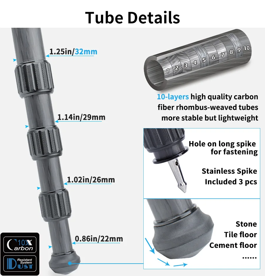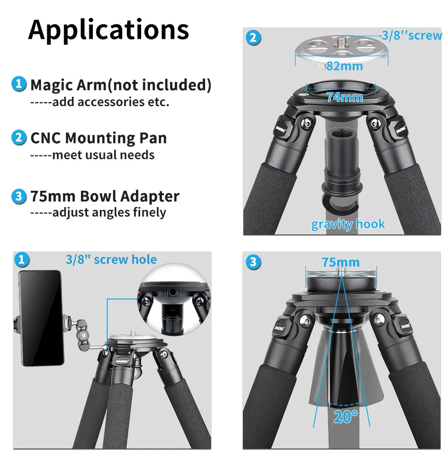 1. Этот штатив изготовлен из высококачественного подлинного 10 слоев углеродного волокна, что делает его компактным и стабильным, вы можете взять там, где вы хотите2. Наш новый дизайн, чаша находится в основном корпусе, делает штатив более надежным и удобным.3. Все основные части этого штатива изготовлены по технологии ЧПУ и анодного окисления, что делает поверхность намного красивее, а цвет более хорошо распределен и изысканен, отказываясь выцветать.4. Монтажная сковорода производится с помощью точной обработки, с высокопрочным крюком на дне. Диаметр монтажной сковороды 80 мм.5. Рукав для блокировки трубки изготовлен из высокопрочного алюминиевого сплава, того же материала, что и основной корпус, новая форма подножки делает штатив стабильным при различных углах, он может удовлетворить различные потребности в съемке.