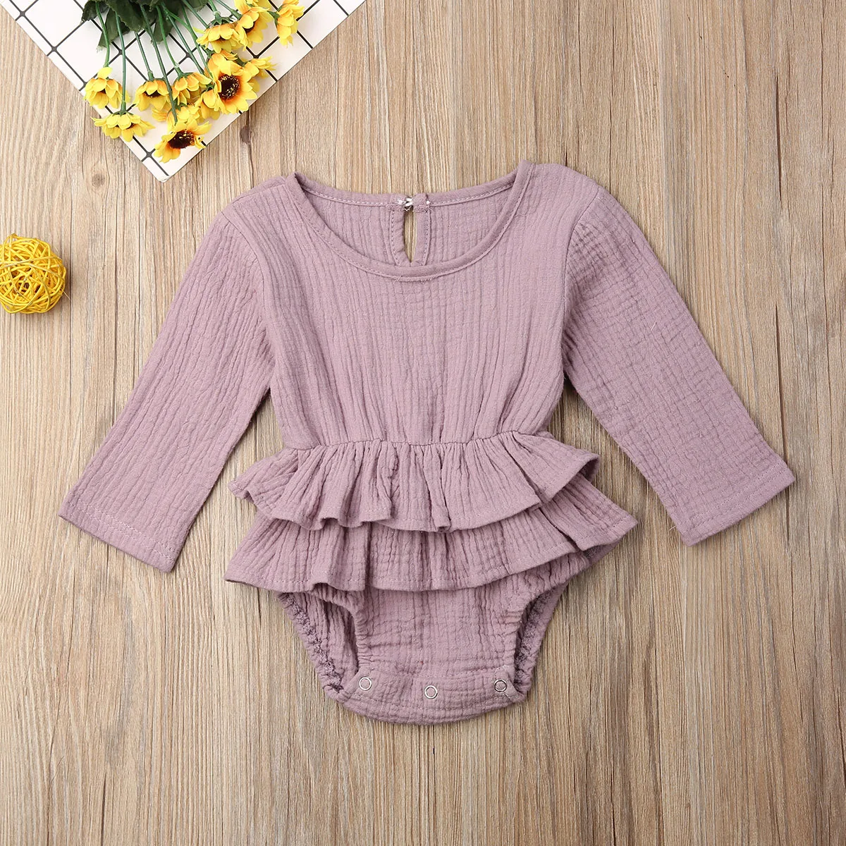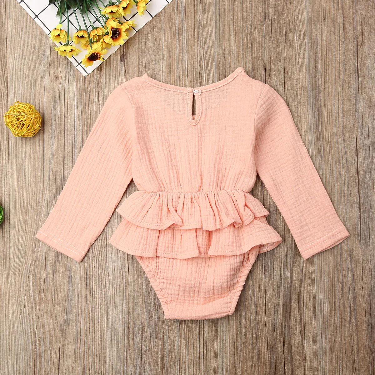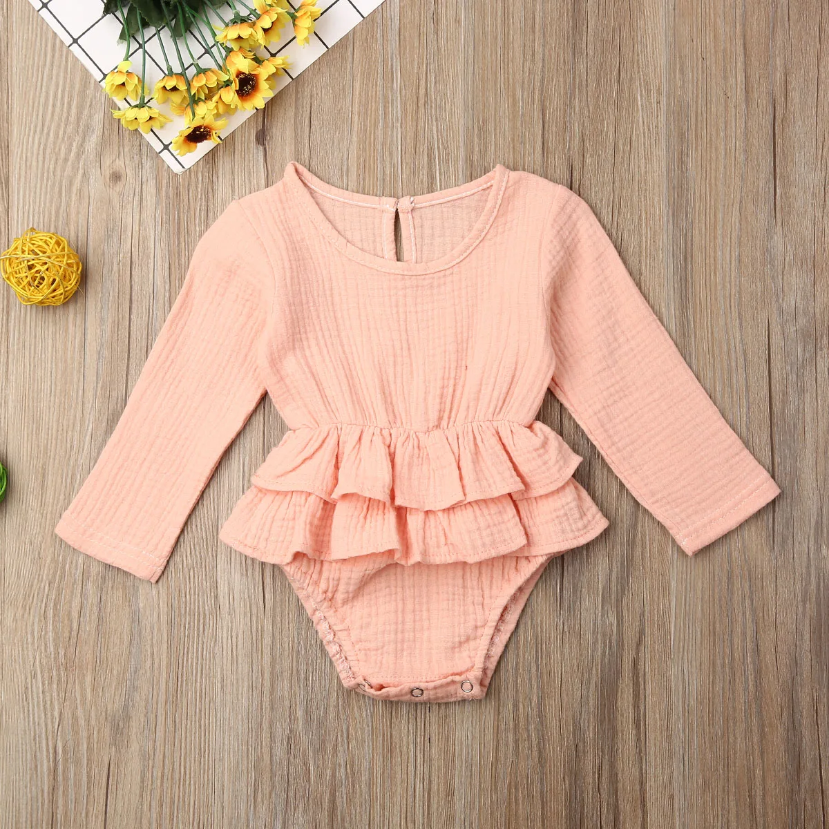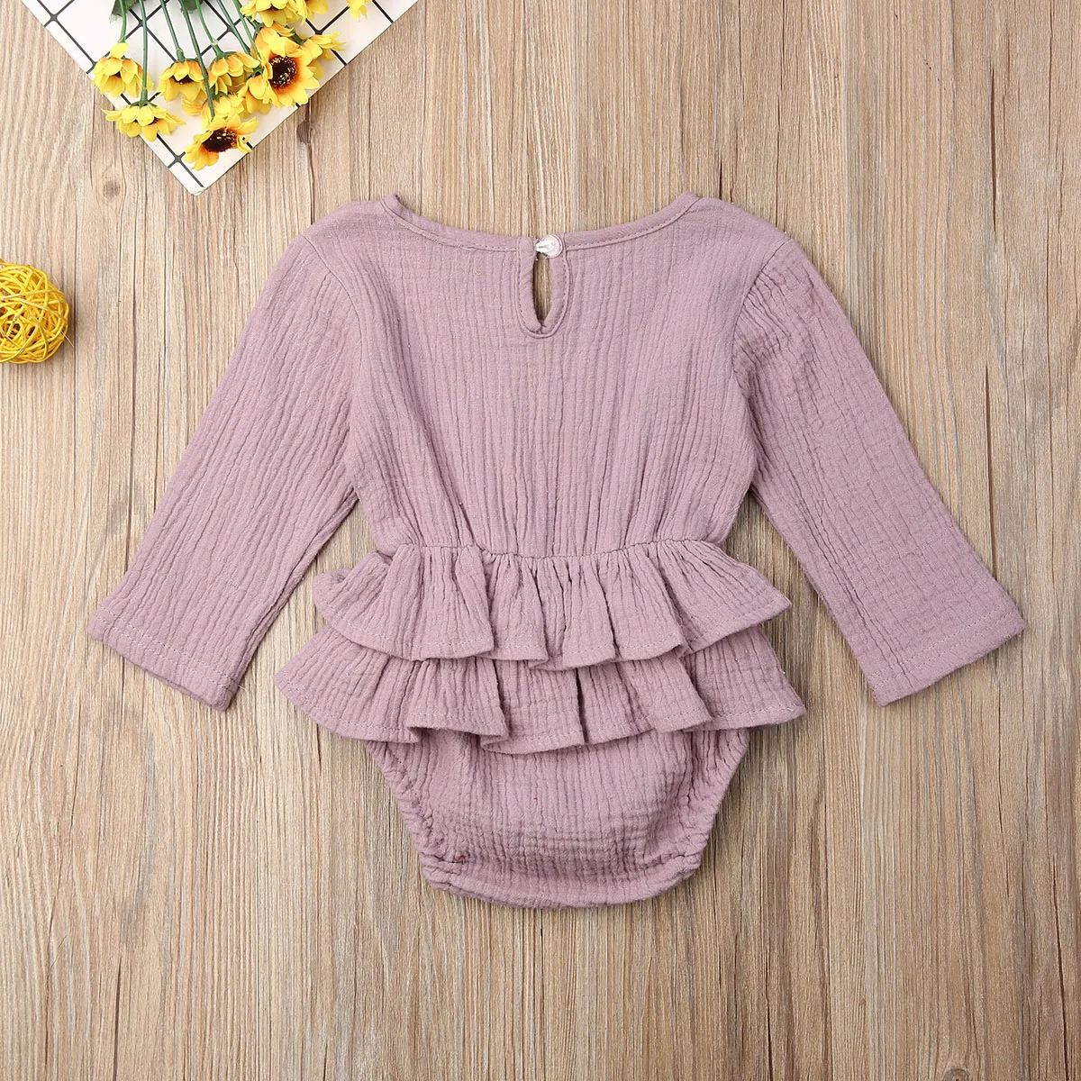 Pudcoco, Одежда для новорожденных девочек, однотонный комбинезон с длинным рукавом и оборками, комбинезон, наряд, одежда из хлопка и льна