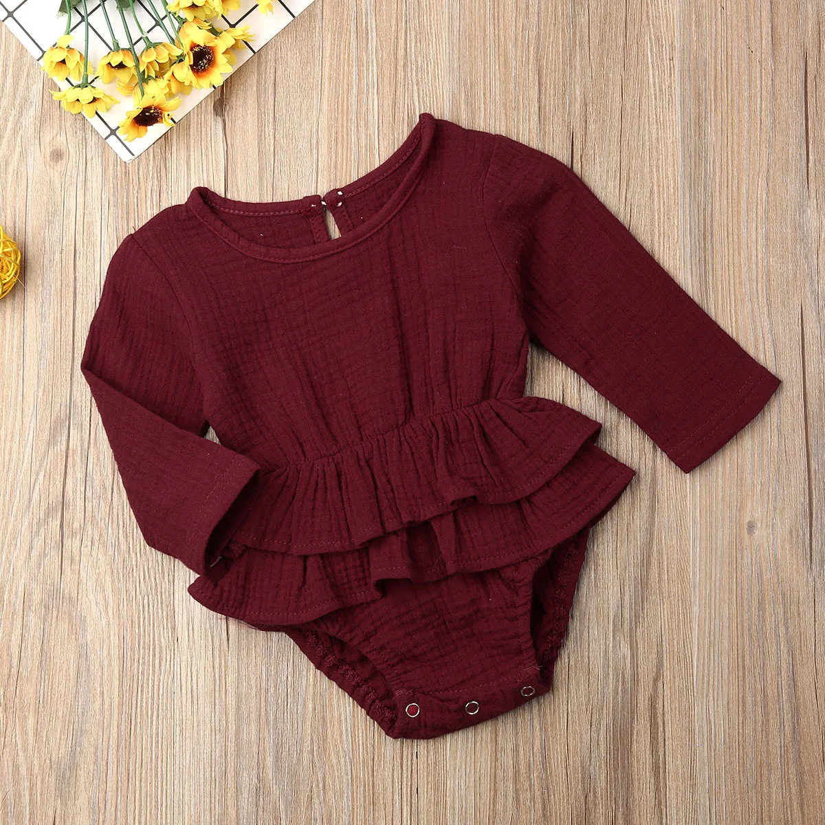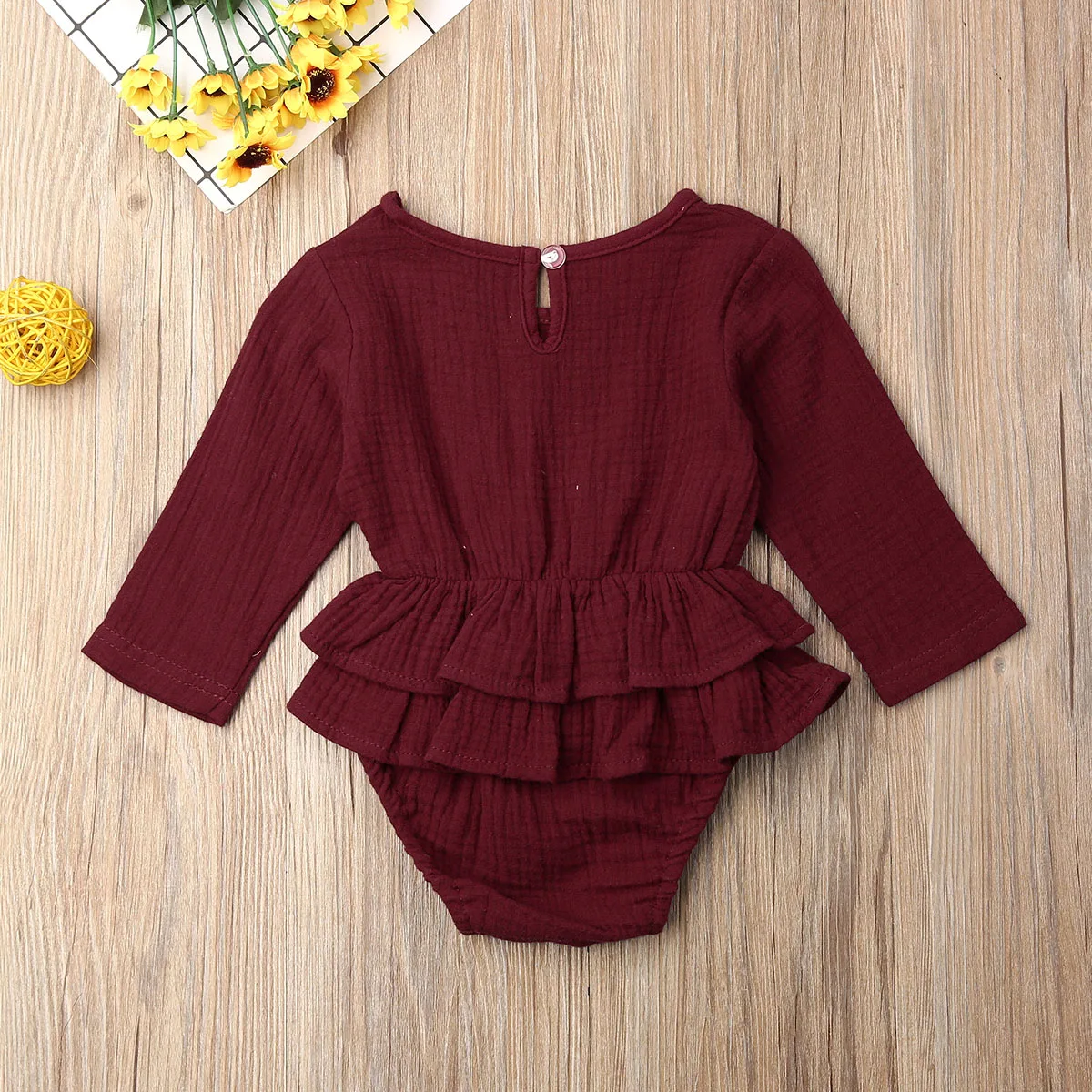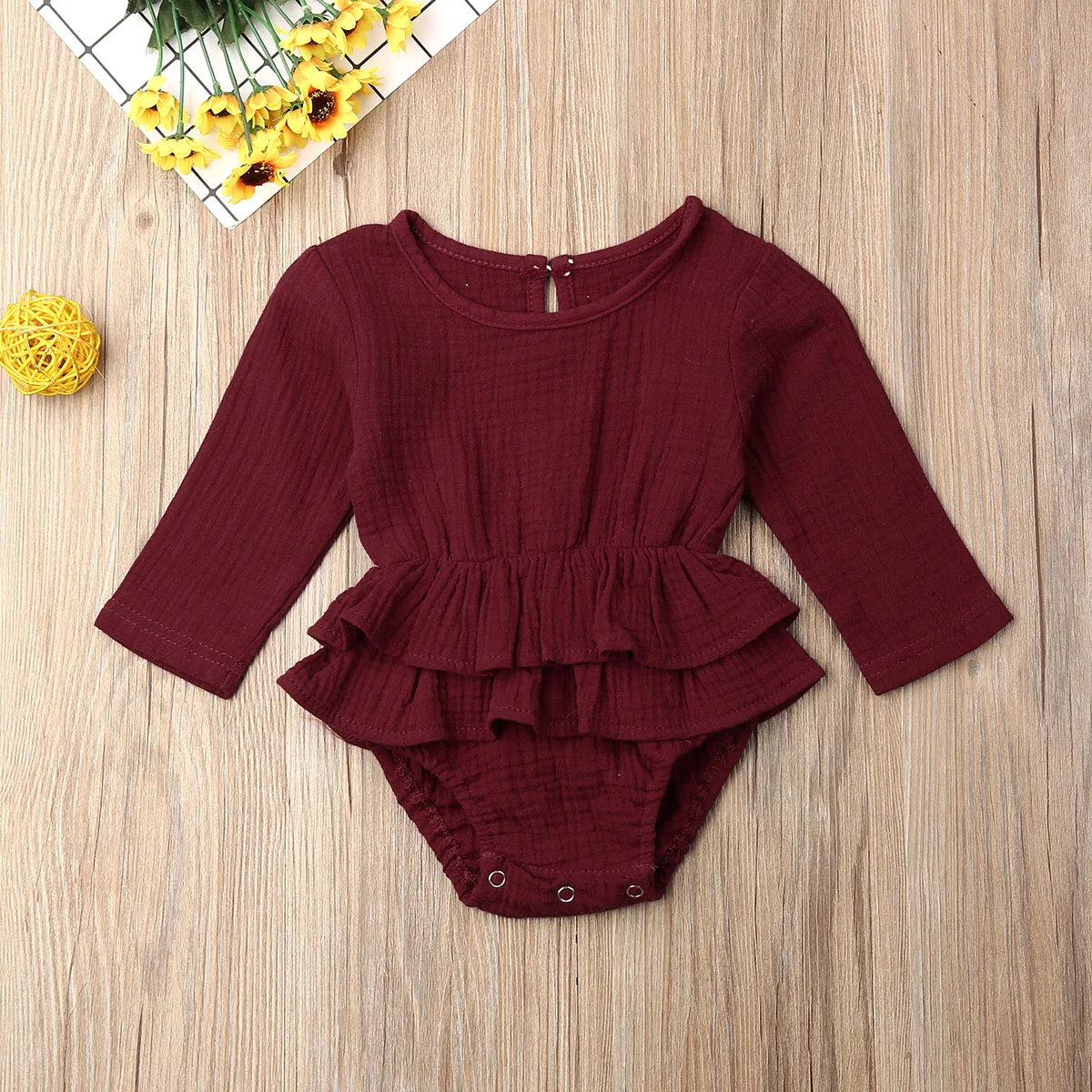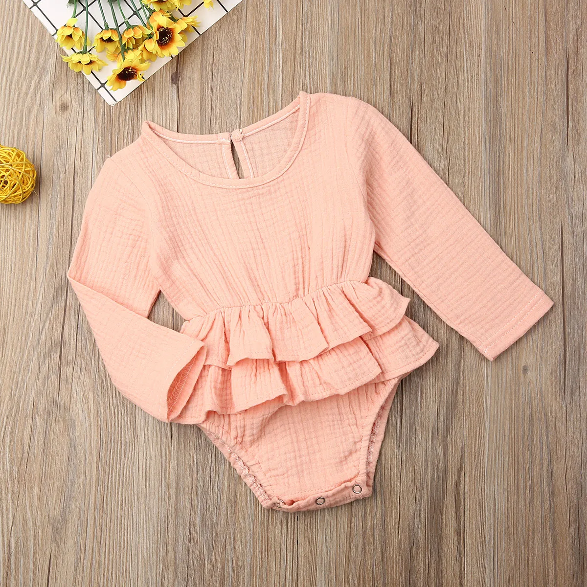 Pudcoco, Одежда для новорожденных девочек, однотонный комбинезон с длинным рукавом и оборками, комбинезон, наряд, одежда из хлопка и льна