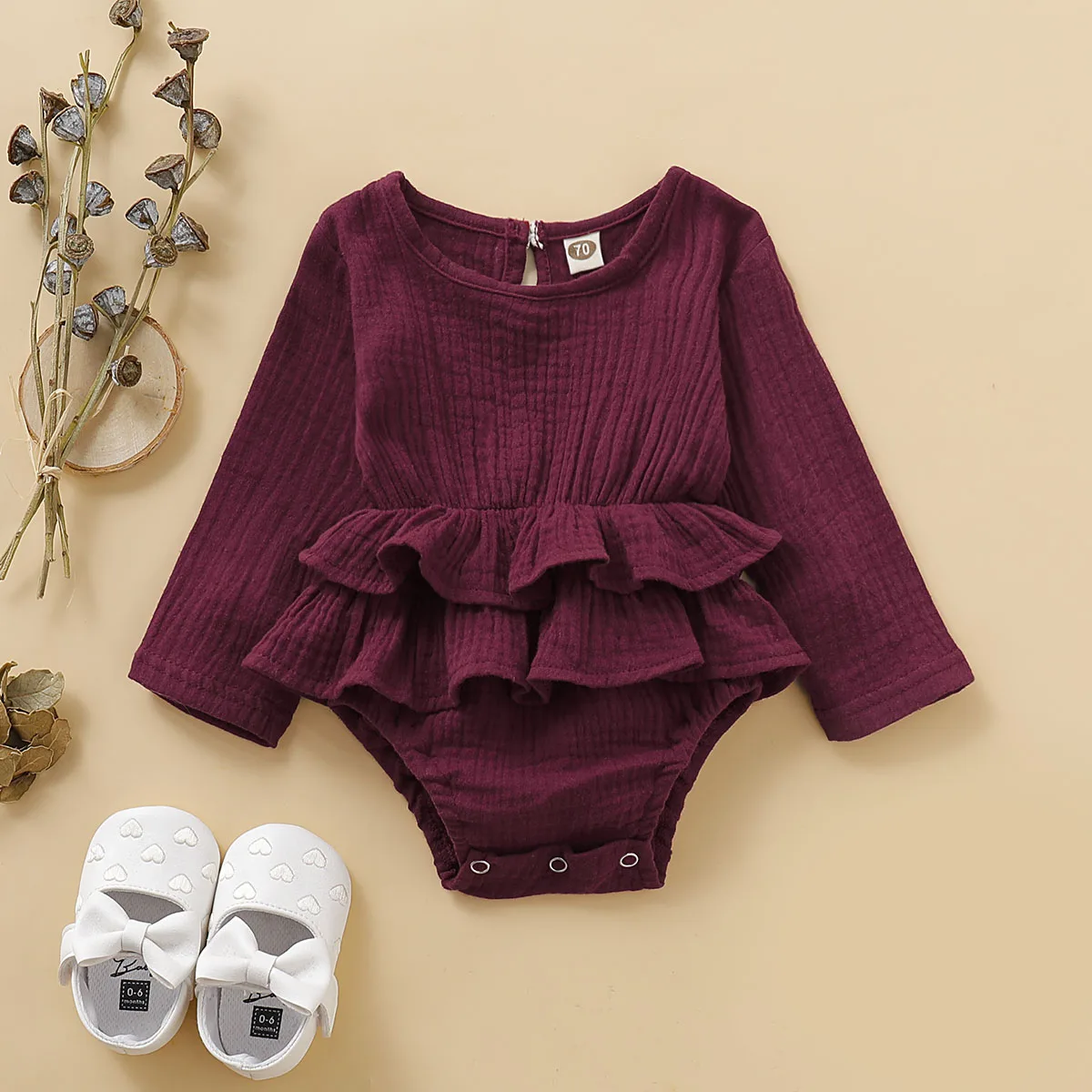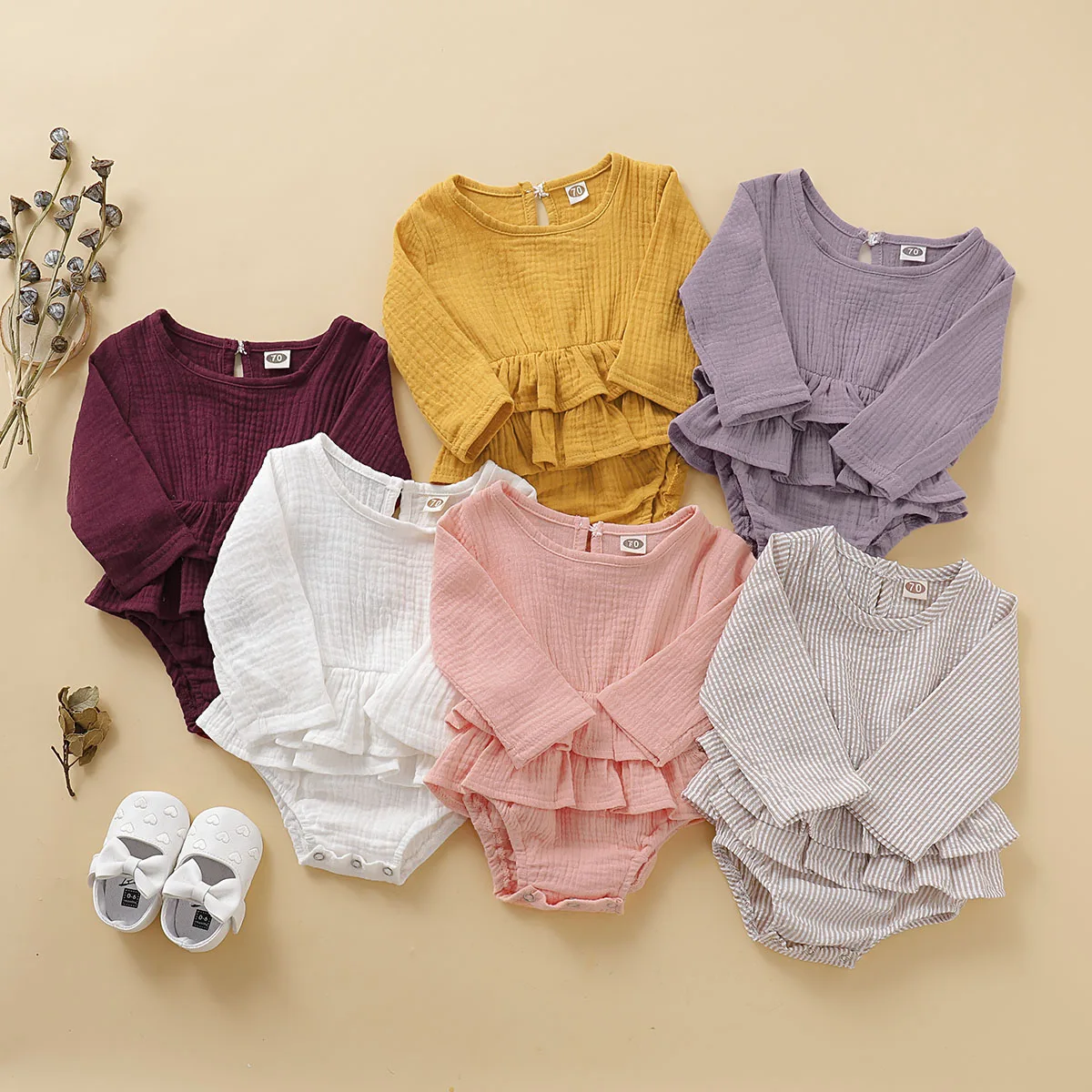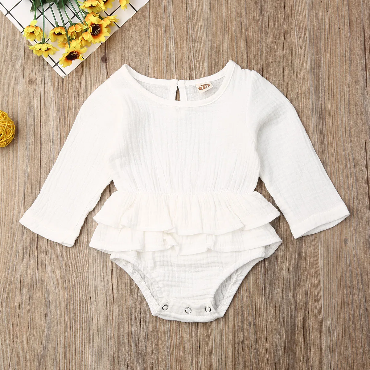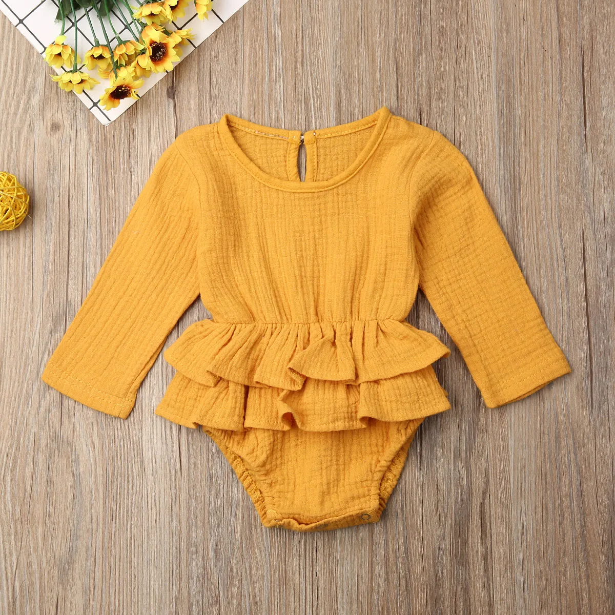 Pudcoco, Одежда для новорожденных девочек, однотонный комбинезон с длинным рукавом и оборками, комбинезон, наряд, одежда из хлопка и льна
