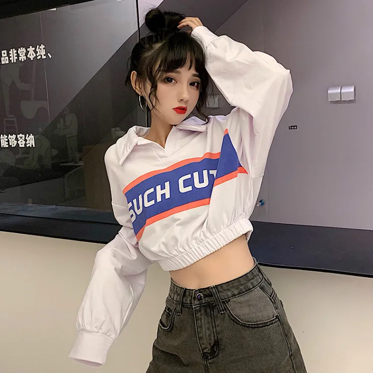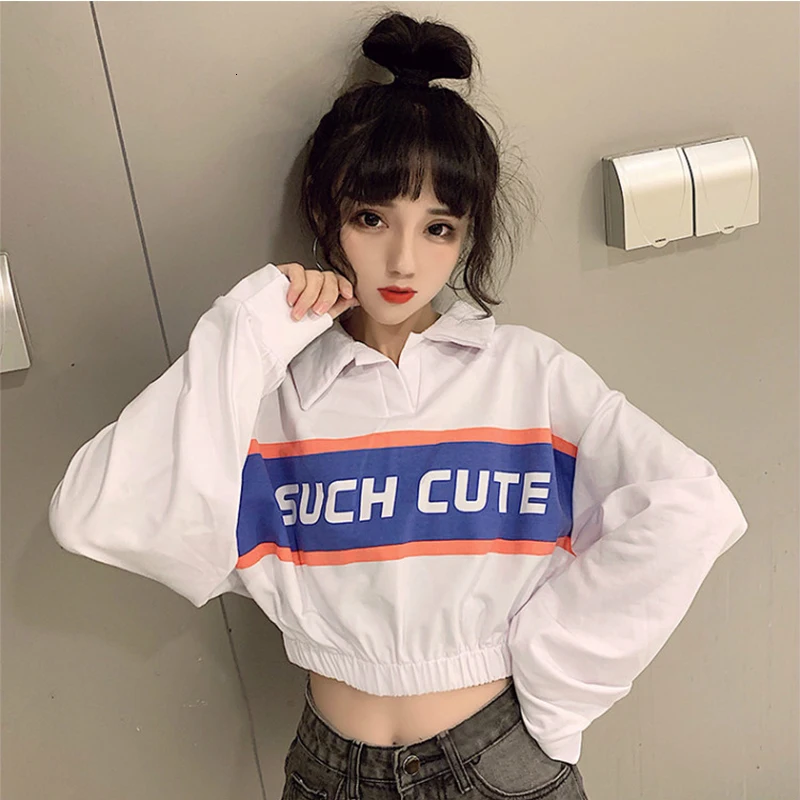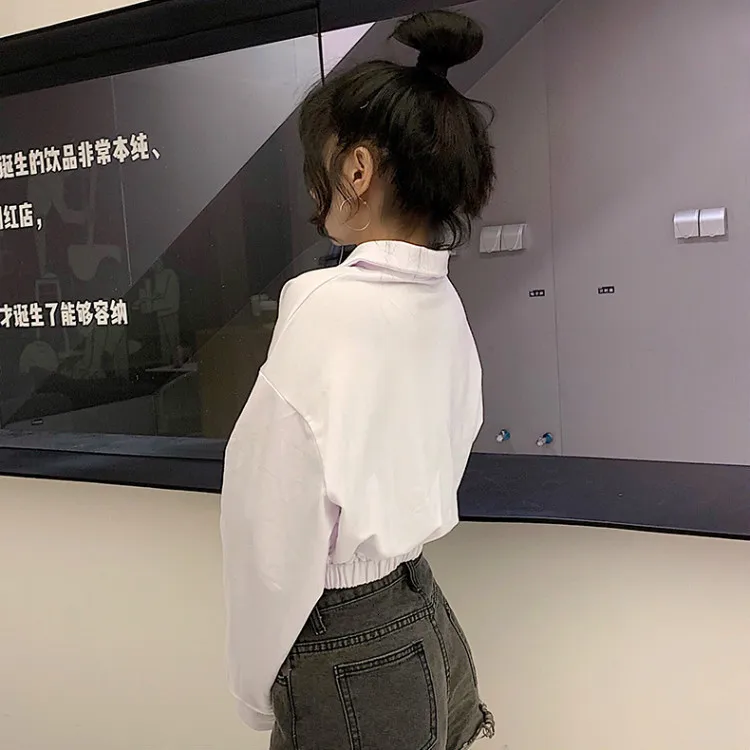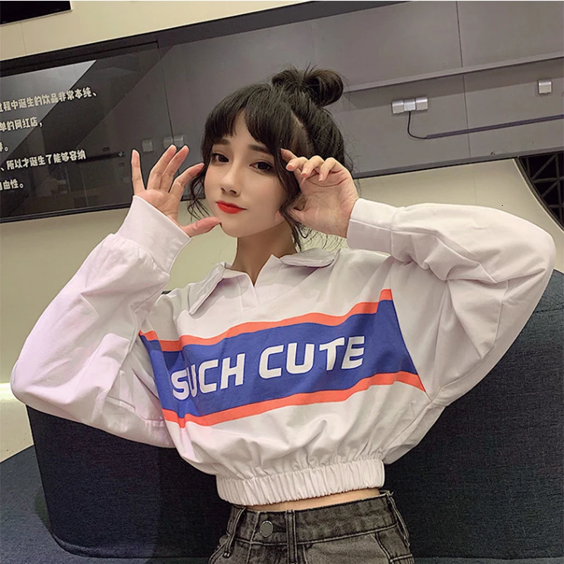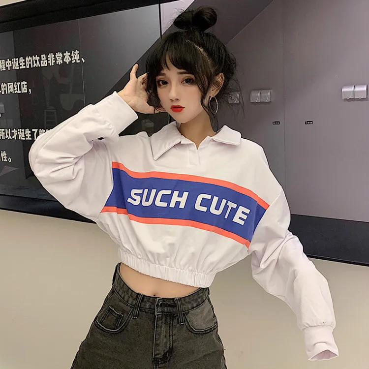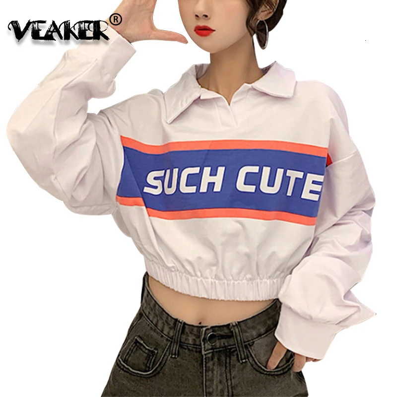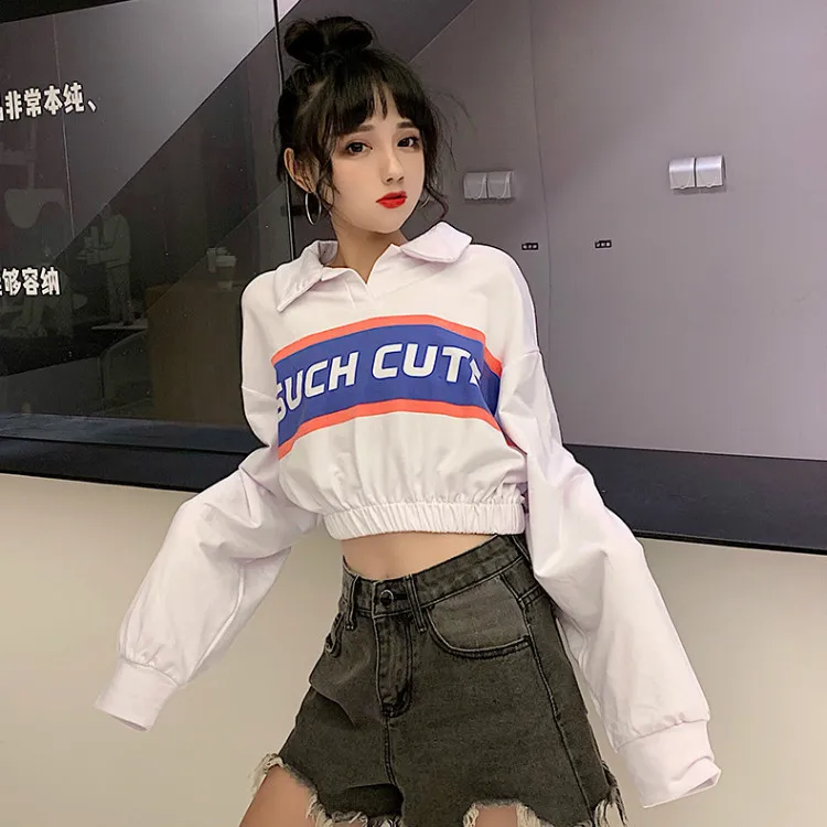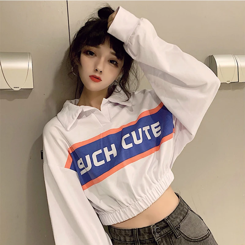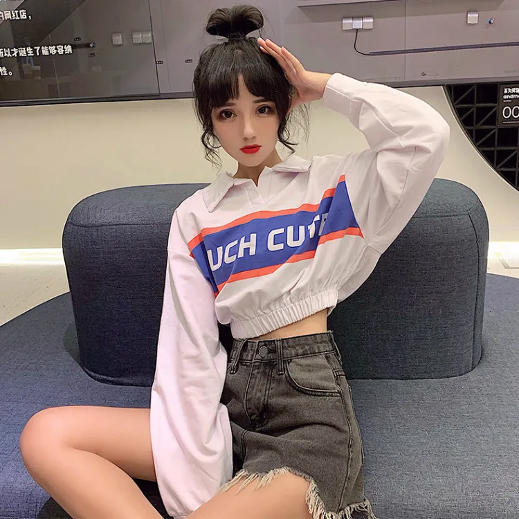 Укороченный топ в стиле Харадзюку женский с длинным рукавом, Милая Короткая Футболка в Корейском стиле, Женский пуловер с отложным воротником, осенняя одежда