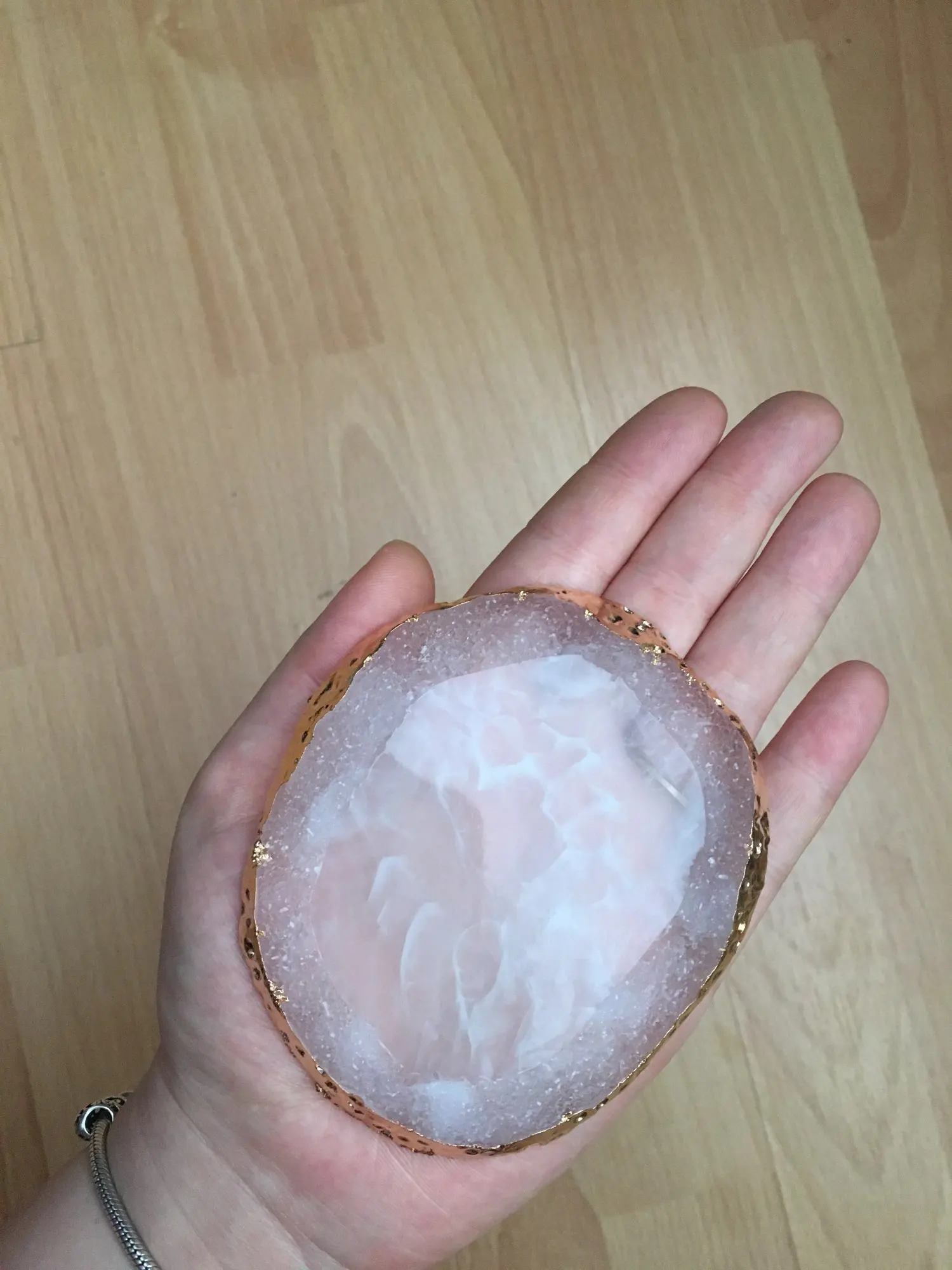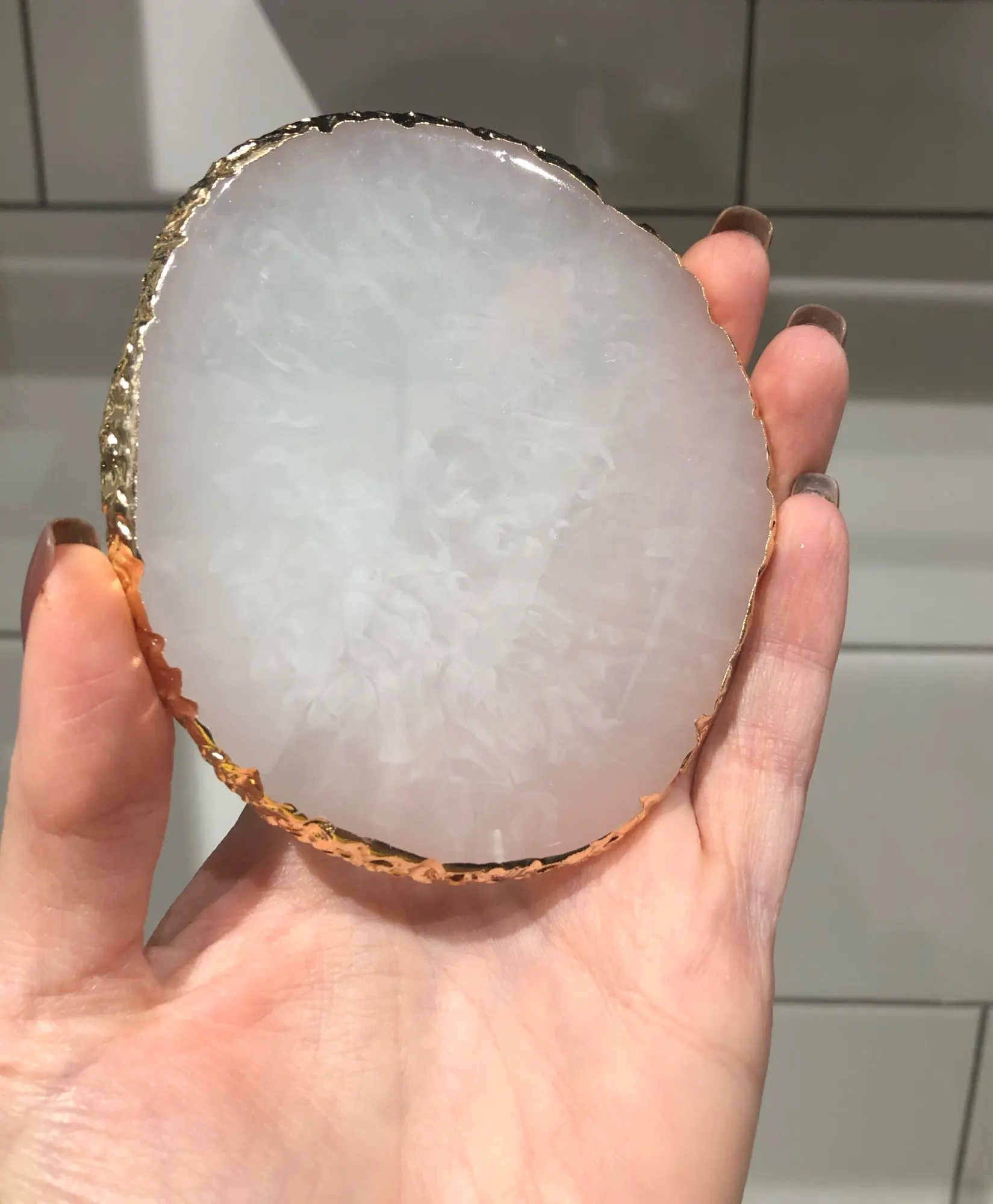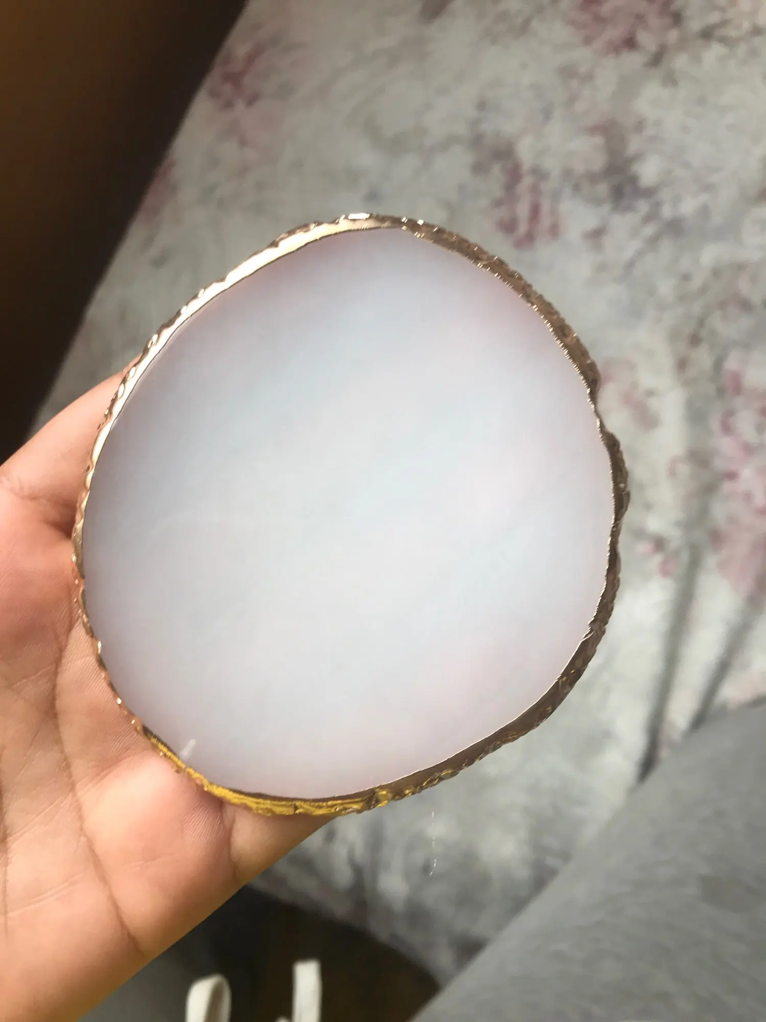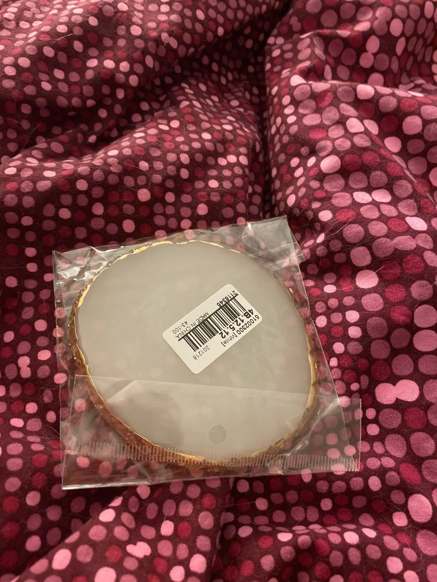 Заказ пришёл за 3 недели, трек отслеживался. В целом всё хорошо, подставка милая, однотонно-Белая. Но мне кажется, она не совсем плоская. С одной стороны она слегка выпуклая, и если поставить на неё бокал вина, например, есть вероятность, что он будет соскальзывать. В целом, довольна. На вид милая. Но очень маленькая (размером с ладошку).