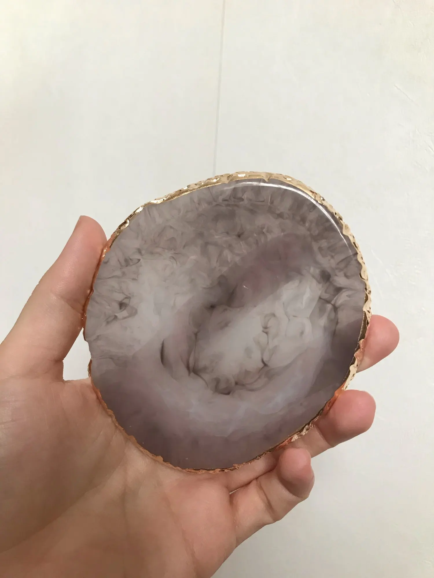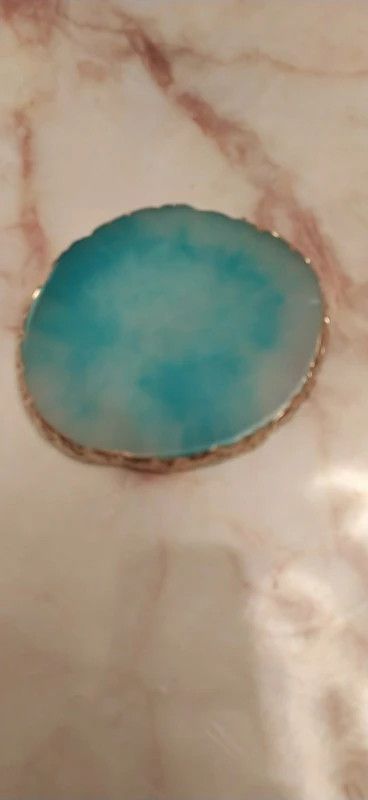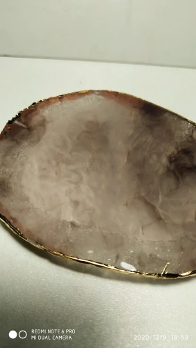 Очень красивая вещь. В Москву пришла через месяц. Выглядит точно как на картинке. Пластиковая, лёгкая. Не камень! Как подставка под горячую чашку боюсь не подойдет