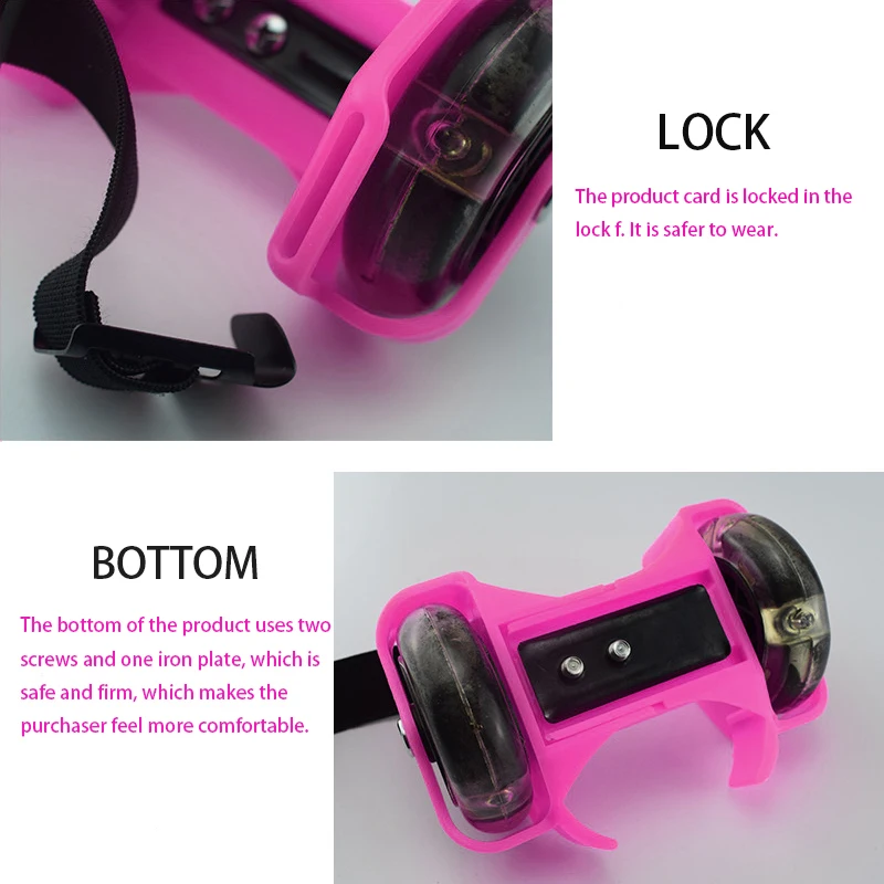 РегулируемыйМигающий Ролик можно отрегулировать через перекрестный ключ (не входит в комплект). Есть три отверстия для изменения в соответствии с практическим положением. КрасочныеКаждый имеет четыре красочные светильник. Когда колеса загораются, светильник становится прохладным в темноте. БезопасныйКонструкция пряжки может плотно зафиксировать ногу на ролике, чтобы обеспечить безопасность использования. Дно состоит из металлической панели, которая является прочной и безопасной в использовании. ПрочныйМигающий ролик изготовлен из высококачественного ПВХ материала и высокопрочной углеродистой стали, которая является износостойкой и гладкой для работы. Область примененияМигающий Ролик предназначен для детей, который может принести вам счастливое время катания на коньках. Его также можно использовать в качестве подарка для ваших детей. Спецификация:Тип: Мигающий РоликКоличество: 2 шт.Материал: ПВХ + TPR + углеродистая стальЦвет: черный/розовыйСветильник источник света: 4 шт. красочные светильникРазмер: 13*9 см/5,11*3,54 дюйма/(Д * Ш * В)Вес нетто: 610 г/1,34 фунта Посылка:2 * Мигающий Ролик1 * коробка для посылка