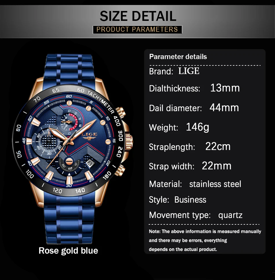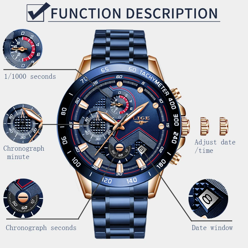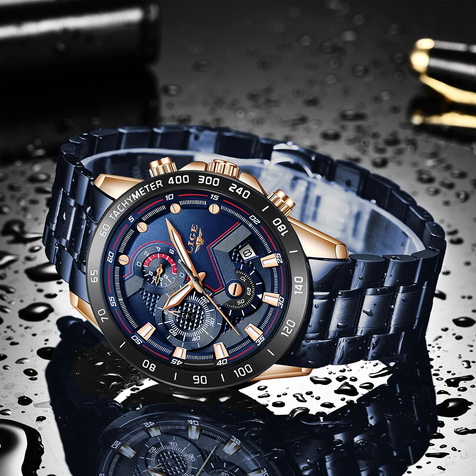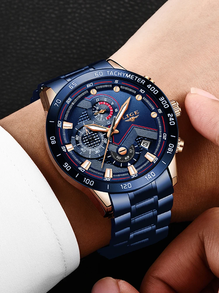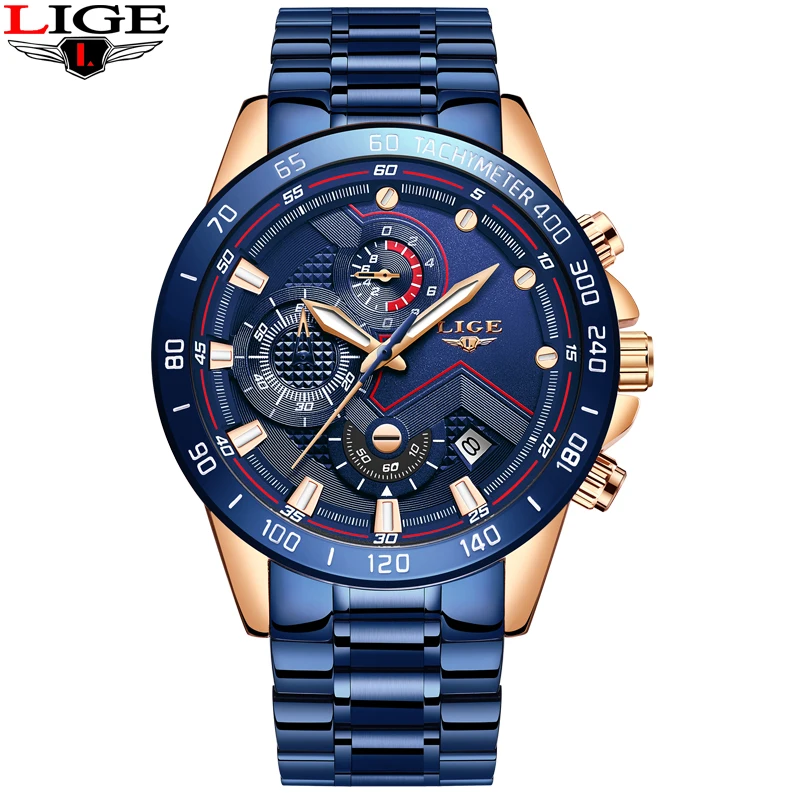 Часы наручные LIGE Мужские кварцевые, роскошные брендовые деловые, из нержавеющей стали, водонепроницаемые повседневные с хронографом и датой, синие, 2021