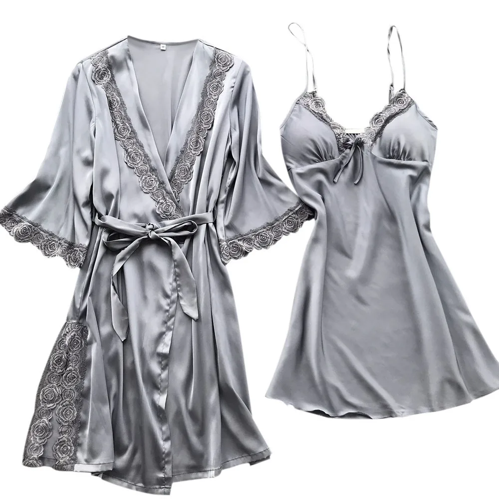 Для женщин кружева сатиновая мягкая Пижама Халат пижамный комплект ...