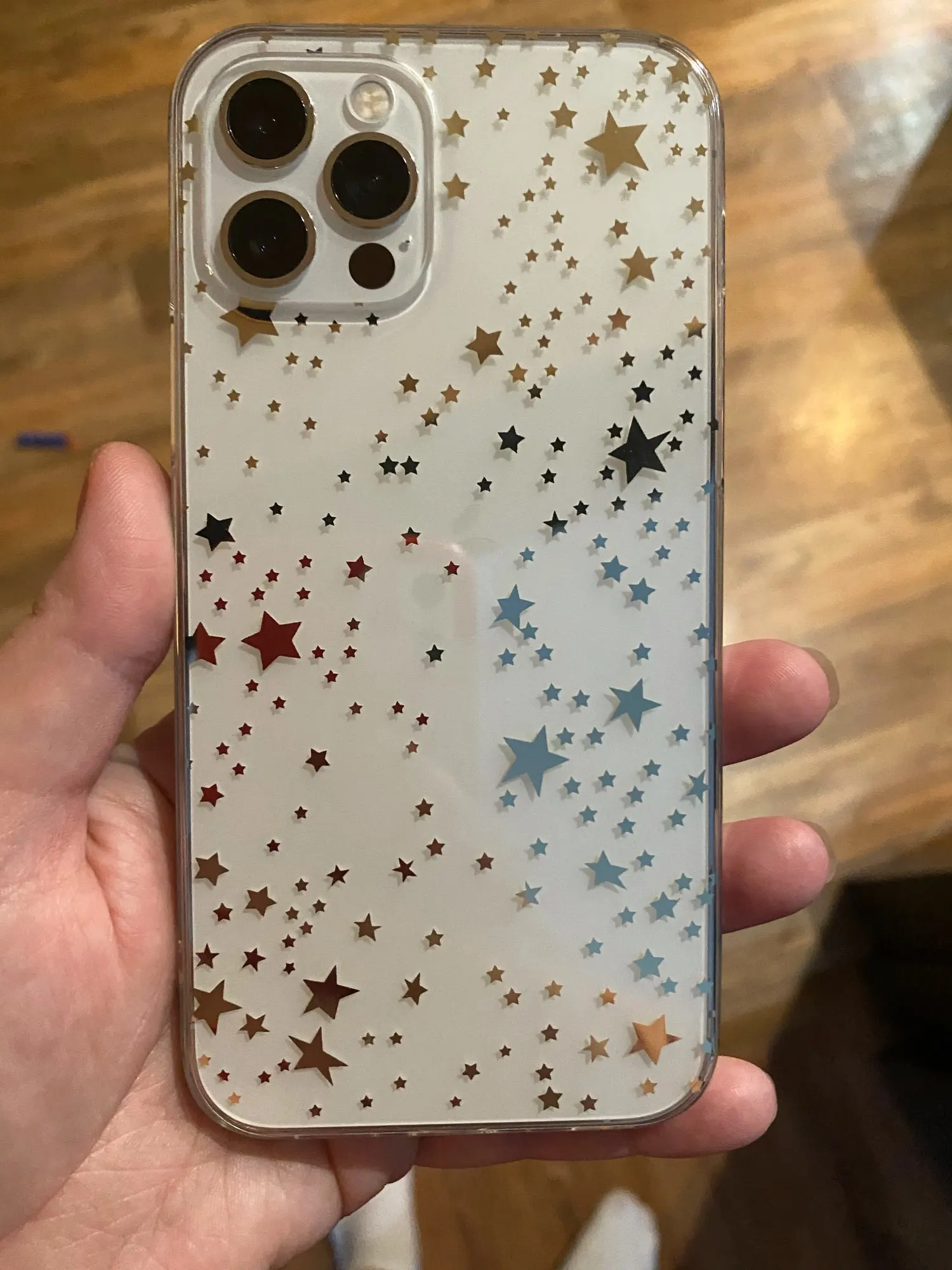 Как на фото. Очень хороший и высококачественный материал, который удивил меня! Звезды напечатаны внутри, поэтому не выцветают сверхурочно и лучше всего... Он защищает удары камеры на 12 pro max. 100% рекомендую его, он чувствует себя потрясающе, держа телефон с ним и очень красиво для рождественского сезона, а также