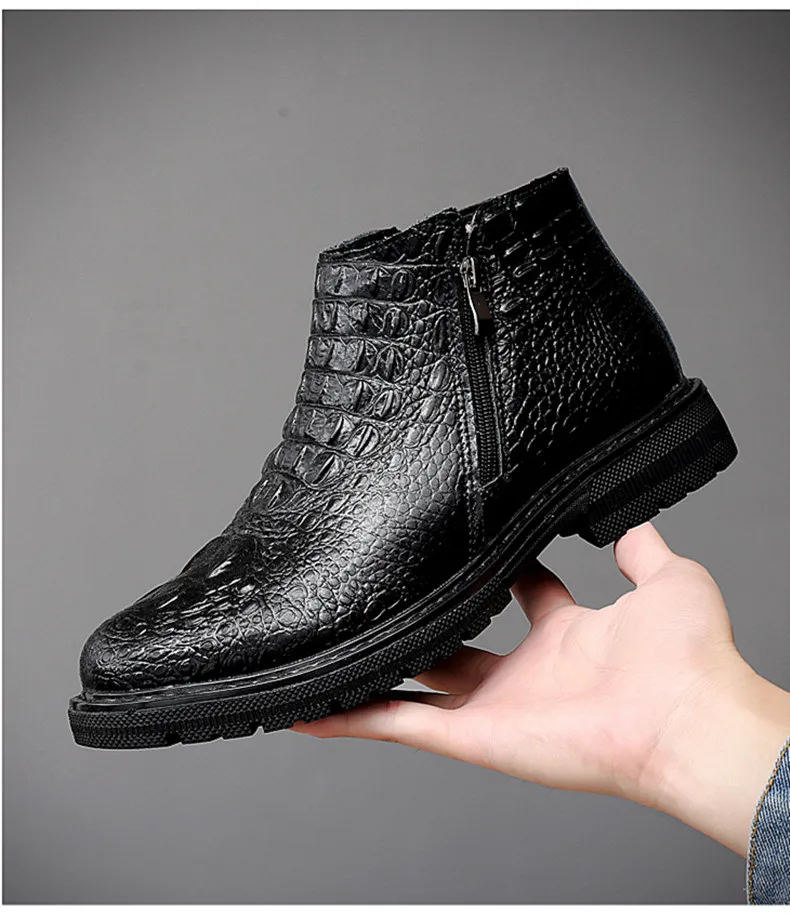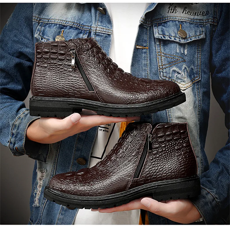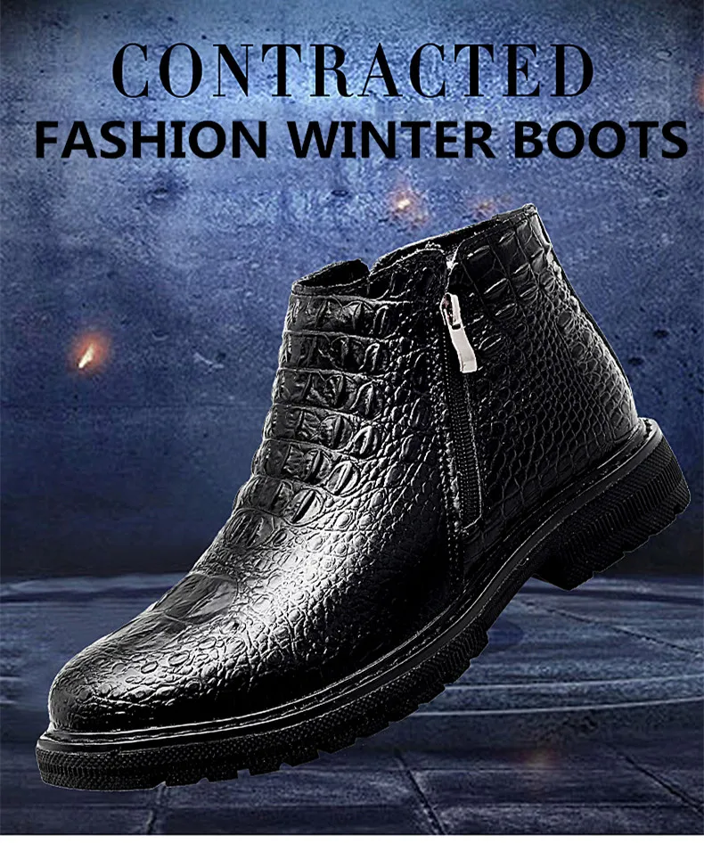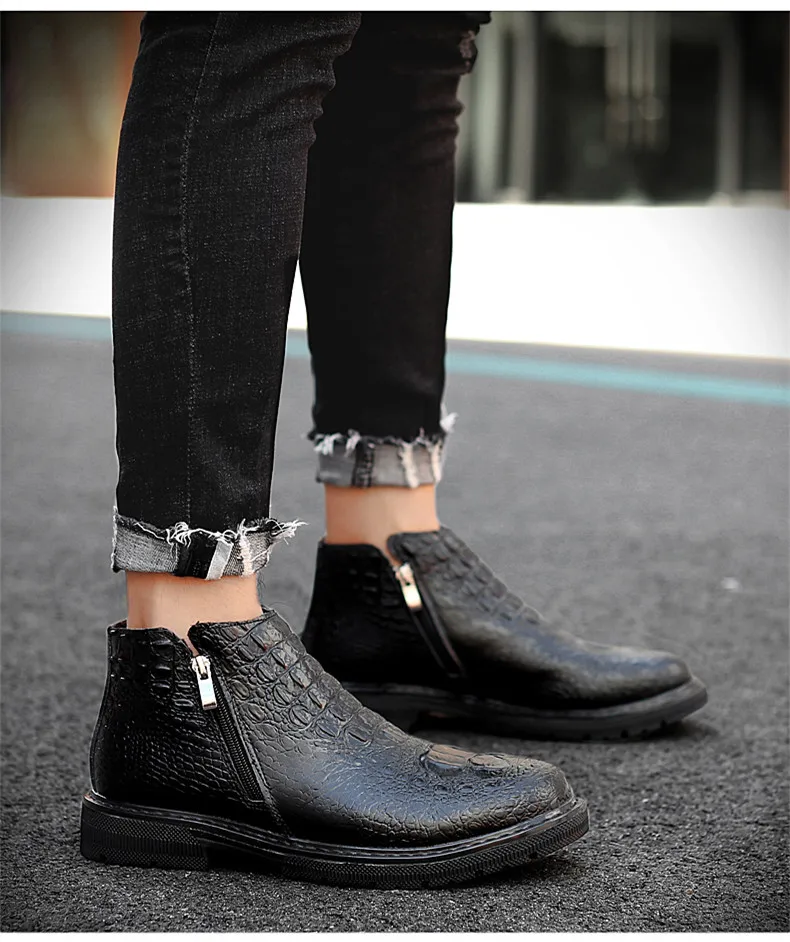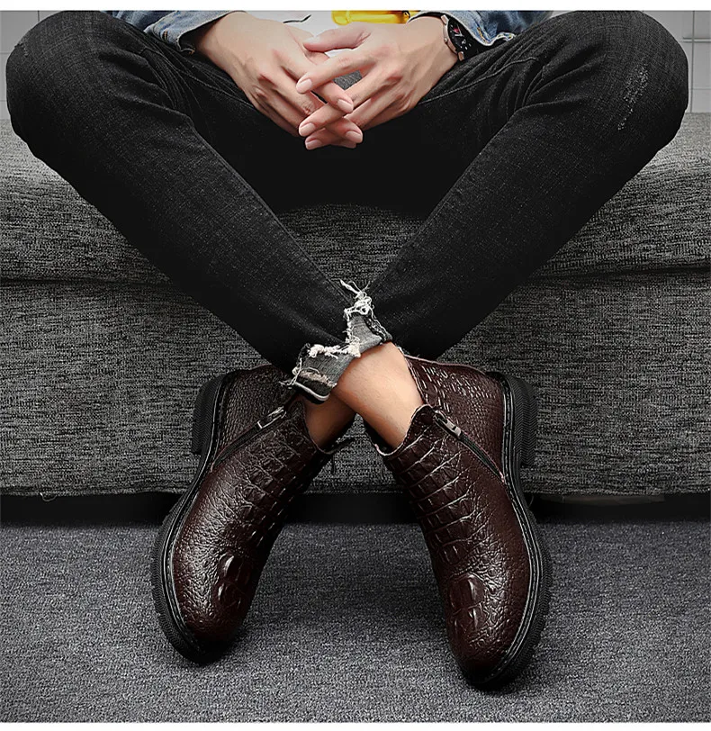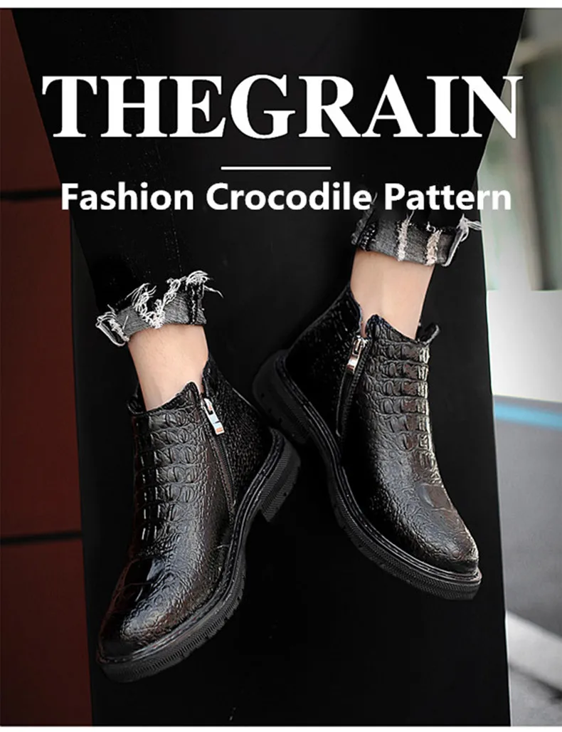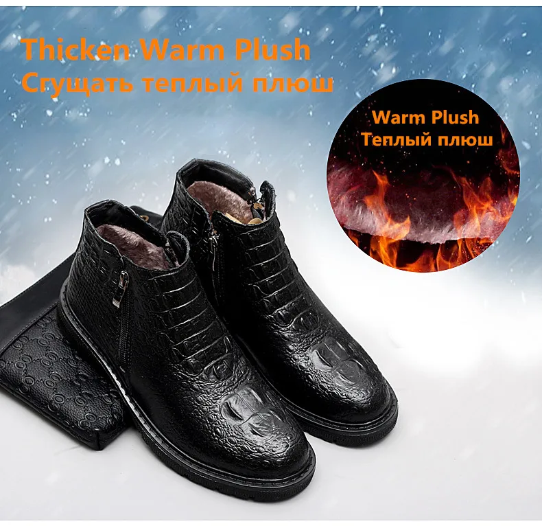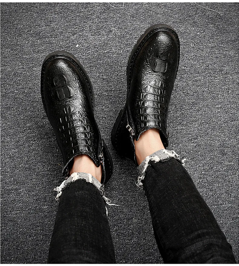 Мужские кожаные ботинки, осенне-зимние теплые ботинки с крокодиловым узором