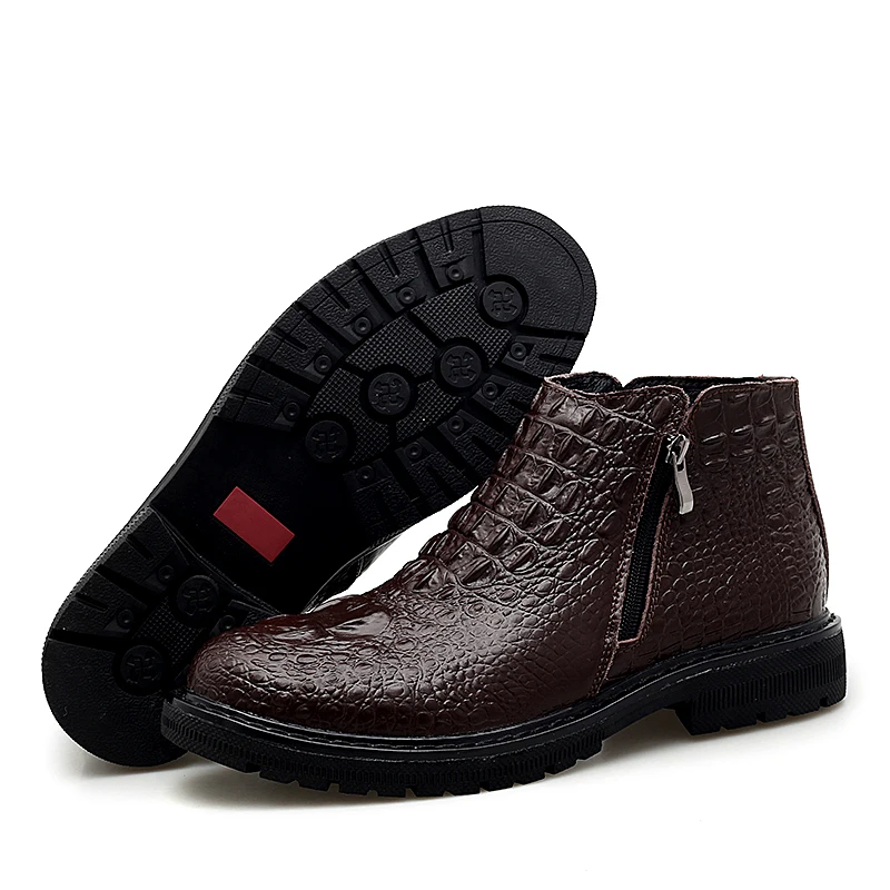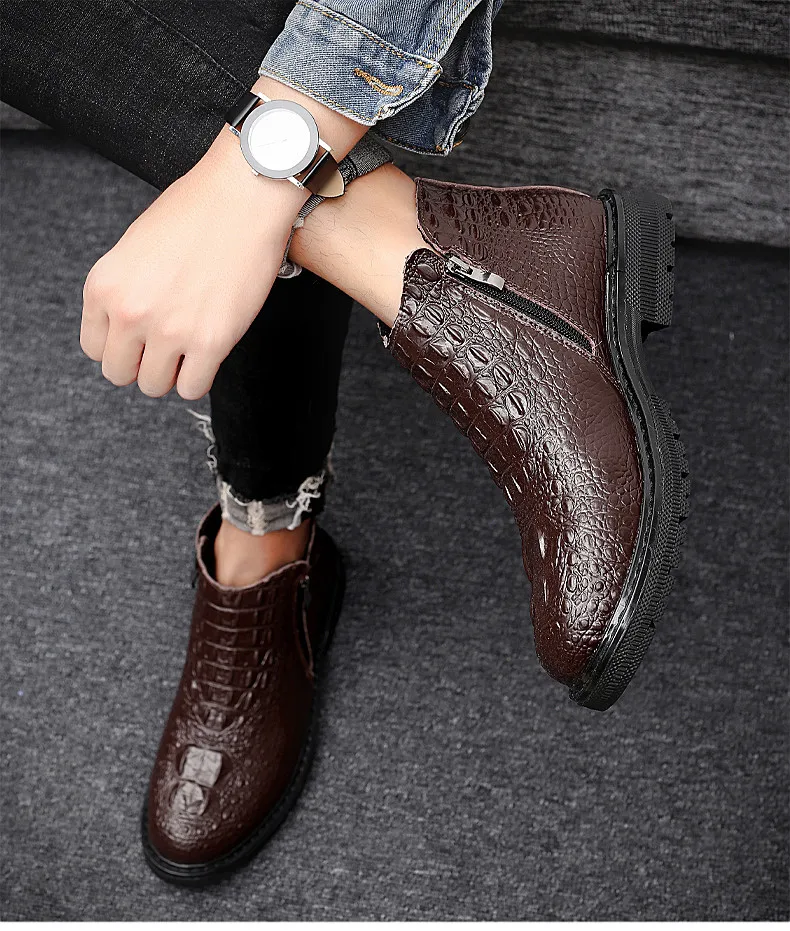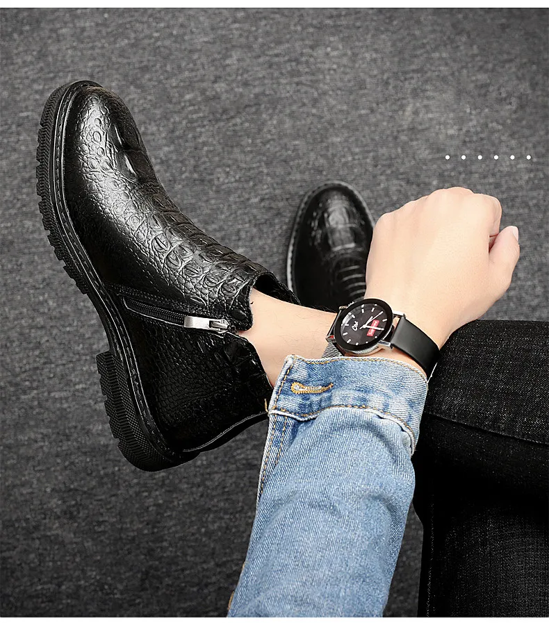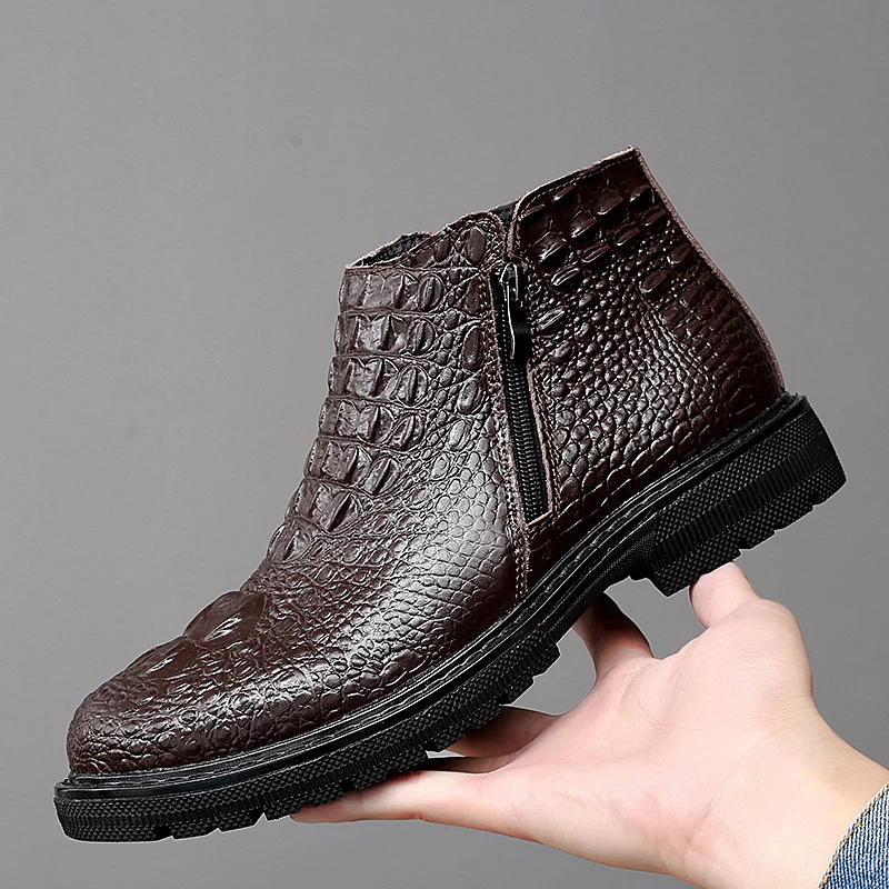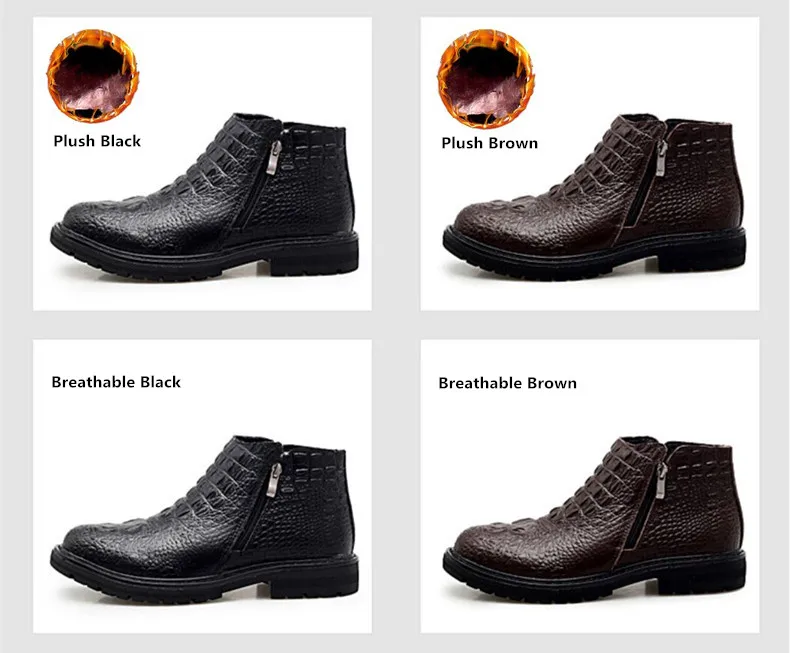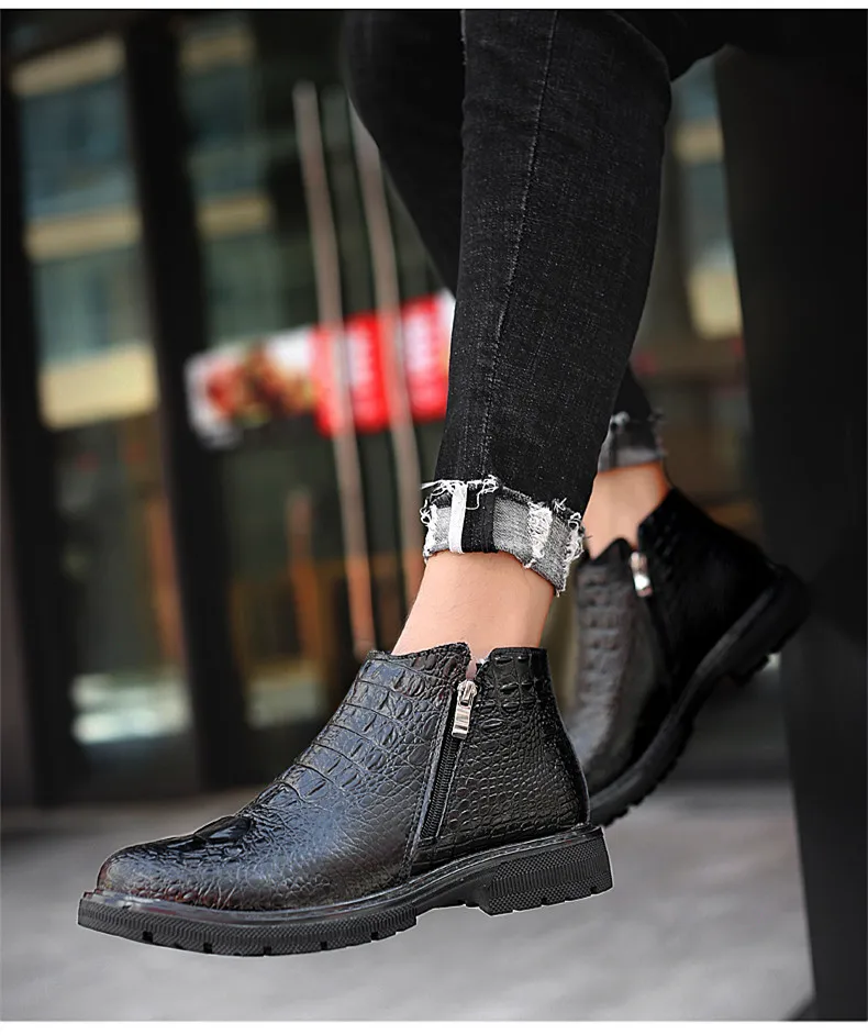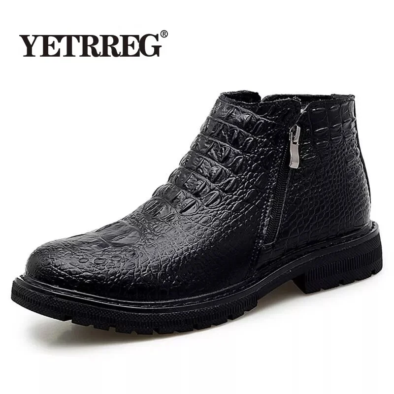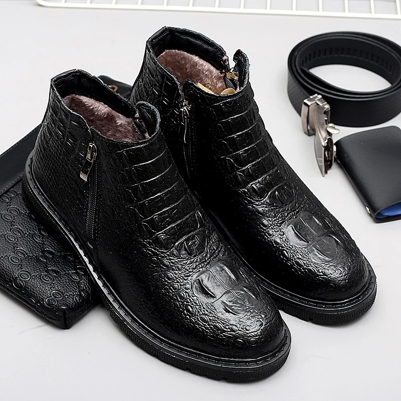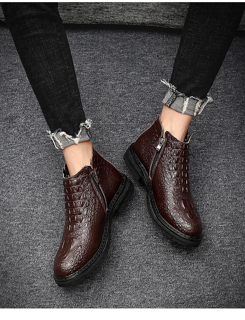 Мужские кожаные ботинки, осенне-зимние теплые ботинки с крокодиловым узором