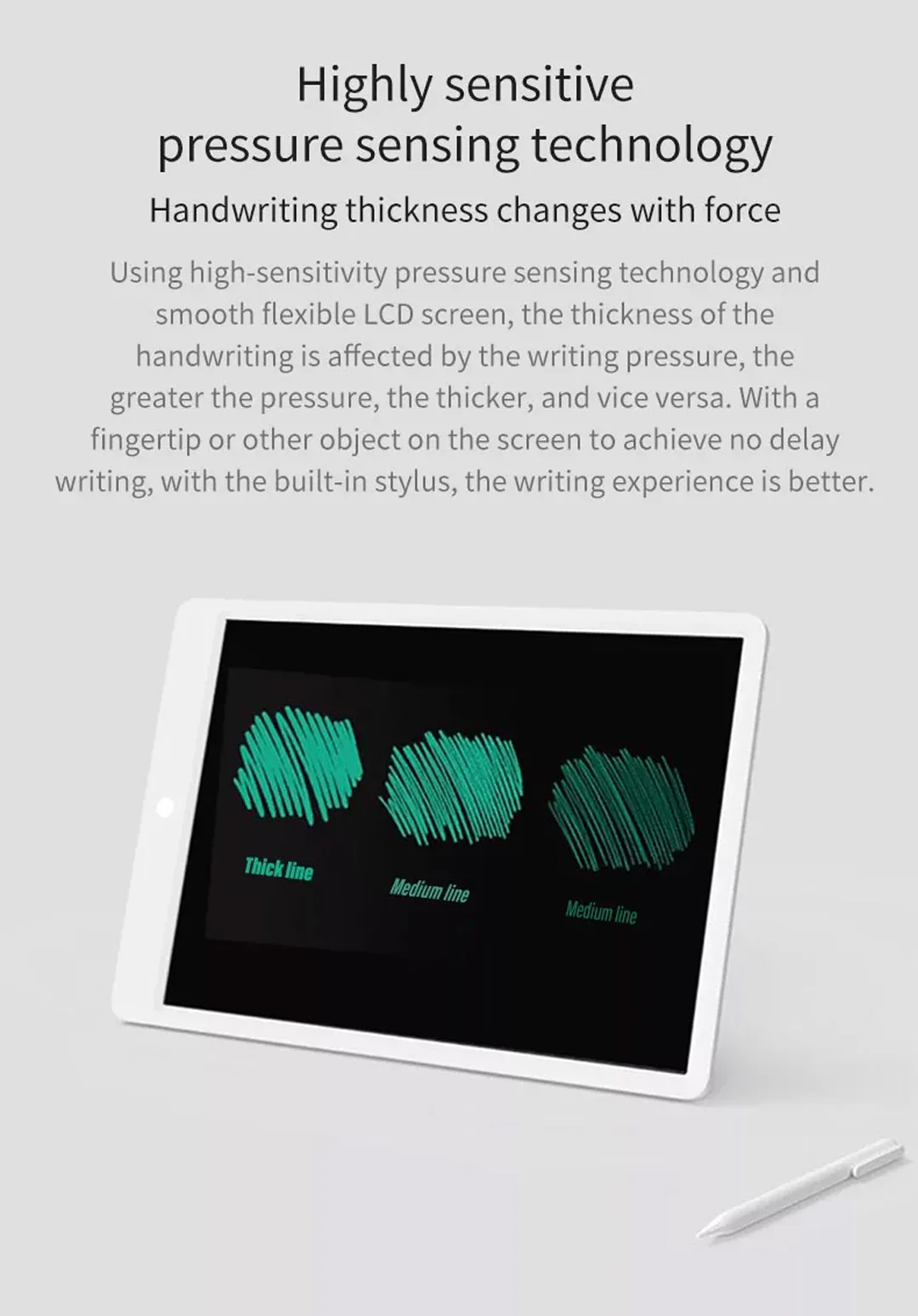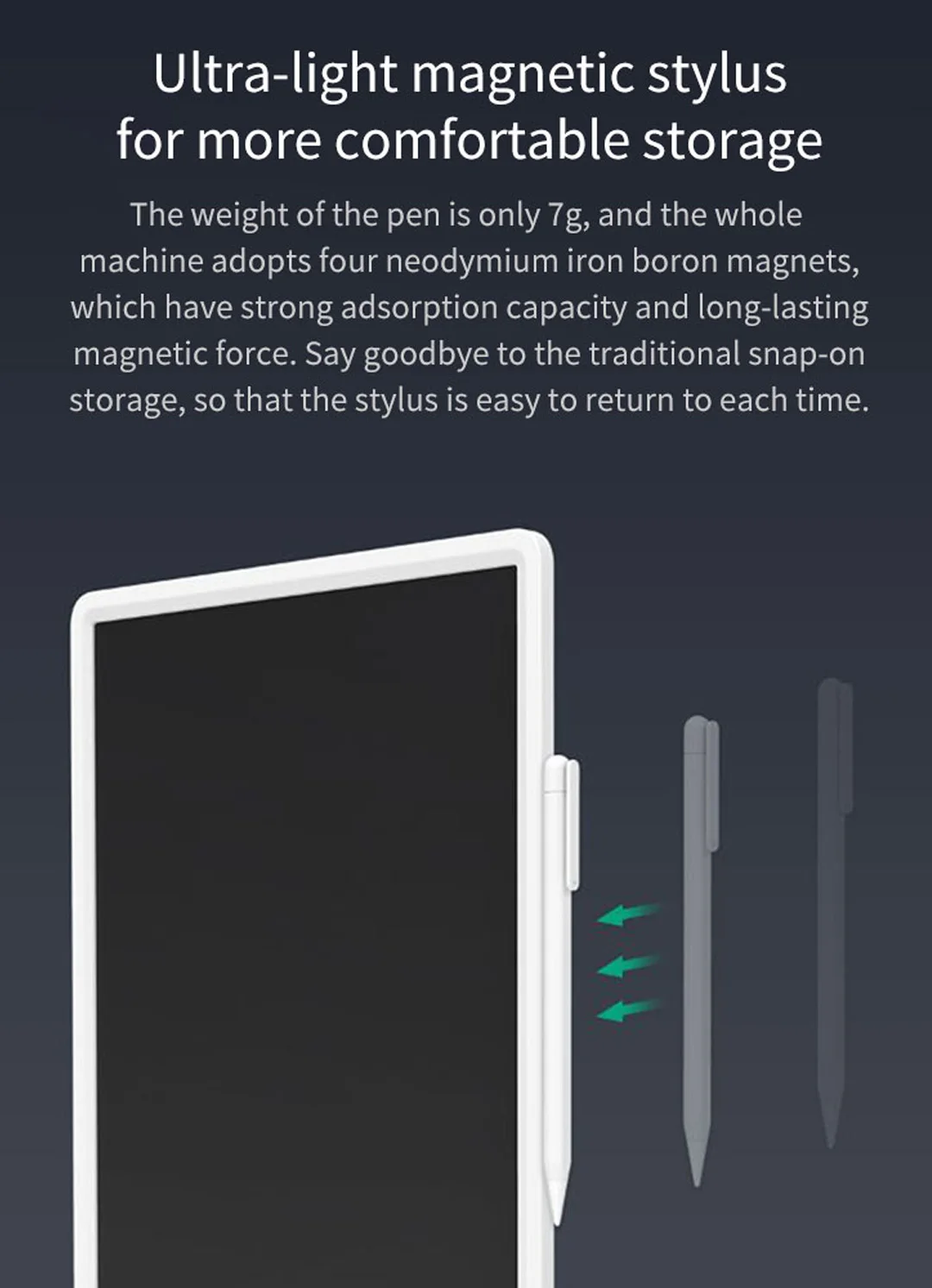 Описание: Xiaomi Mijia LCD маленькая доска со стилусом -Вы можете рисовать, когда захотите, записывайте момент вдохновения Чувствительное к давлению письмо; Супер чистый почерк; Магнитное поглощение; Светильник, легко носить с собой. -Индивидуальная Формула ЖК-пленки, четкий почерк Маленькая доска Xiaomi Mijia LCD принимает индивидуальную формулу жидкокристаллической пленки, сине-зеленый почерк, четкий и привлекательный дисплей, как реальный опыт написания традиционной бумаги, так и плавный опыт ЖК-экрана. -Высокочувствительная технология определения давления Толщина почерка меняется с силой. -Дисплей устройства не излучает синий светильник, уменьшая нагрузку на глаза при длительном использовании. -Одна кнопка, чтобы очистить низкое энергопотребление, длительный срок службы батареи является более беззаботным ЖК-экран с нулевой мощностью потребляет только небольшое количество энергии, когда он очищается. Если вы удаляете 100 раз в день, аккумулятор кнопки используется для 365 дней. -Ультрамагнитный стилус-светильник для более удобного хранения Вес ручки составляет всего 7 г, и вся машина использует четыре неодимовых магнита из железного бора, которые обладают сильной адсорбционной способностью и долговечной магнитной силой. -Ультратонкий корпус, легко носить с собой Тонкий корпус 7 мм тонкий, светильник и портативный, что снижает нагрузку на путешествия. Характеристики: Бренд: XIAOMI Материал: ABS + LCD Размер S соответствует размерам 10 дюймов: L 17,3 см x D 24,4 см х 0,7 см Размер L соответствует 13,5 дюймов: L 22,5 см x 31,8 см x 0,7 см Вес S соответствует размерам 10 дюймов: 195 г, L-13,5 дюймов: 345 г Вес ручки: 7 г Питание: аккумулятор CR2025 (в том числе) Посылка включает в себя: 1 x Xiaomi Mijia LCD маленькая доска с стилусом