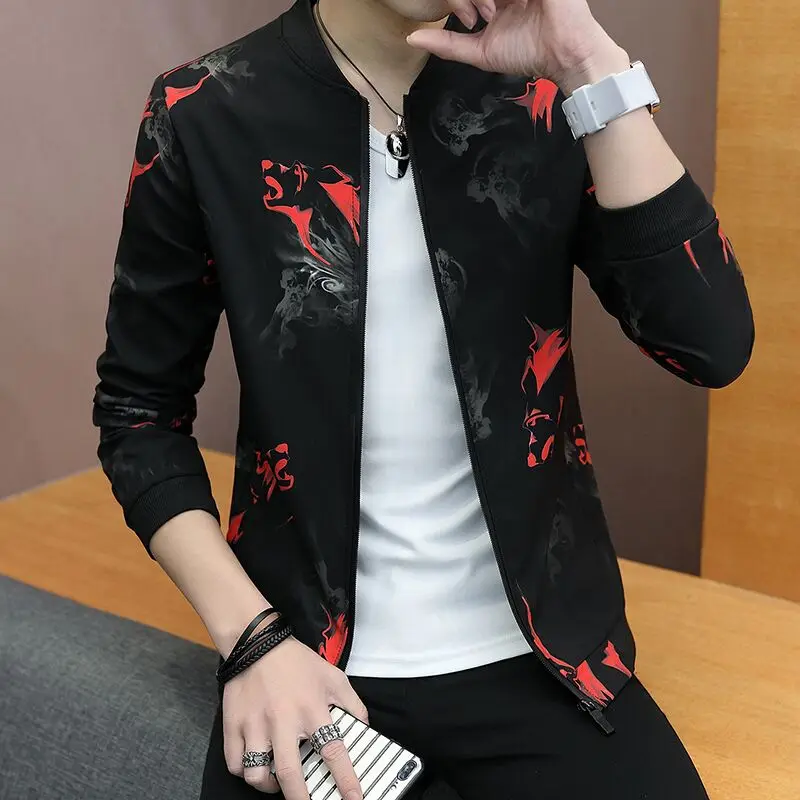 Мужская приталенная куртка с длинным рукавом, с цветочным принтом