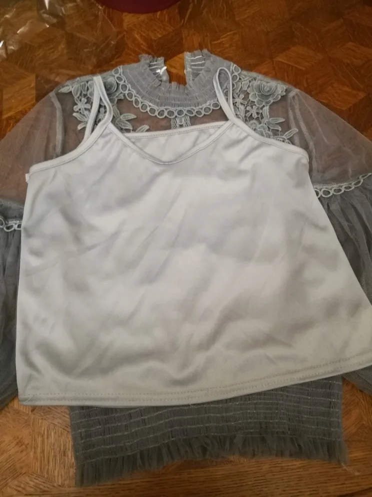 Красивая блузка хорошего качества, приятный серый цвет. Материал - мягкая сетка. В комплекте с топом (синтетика, но приятная к телу). Размер на 44 подходит