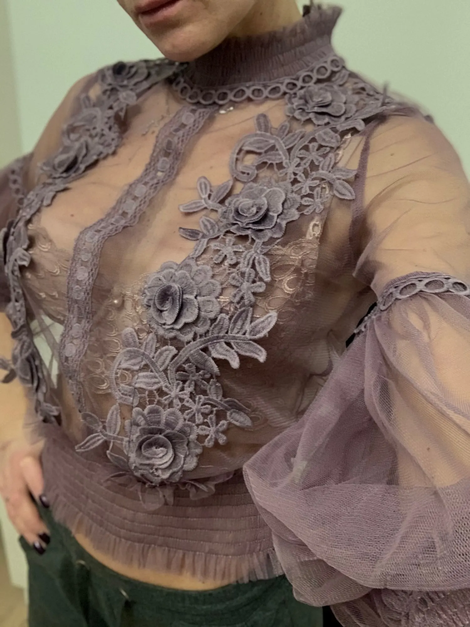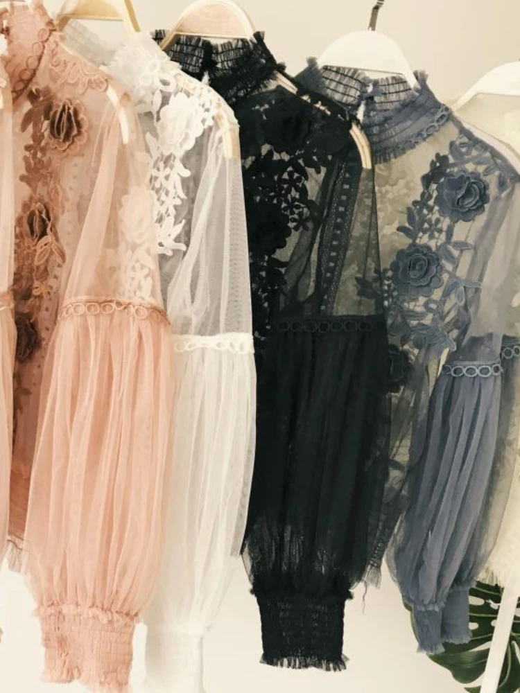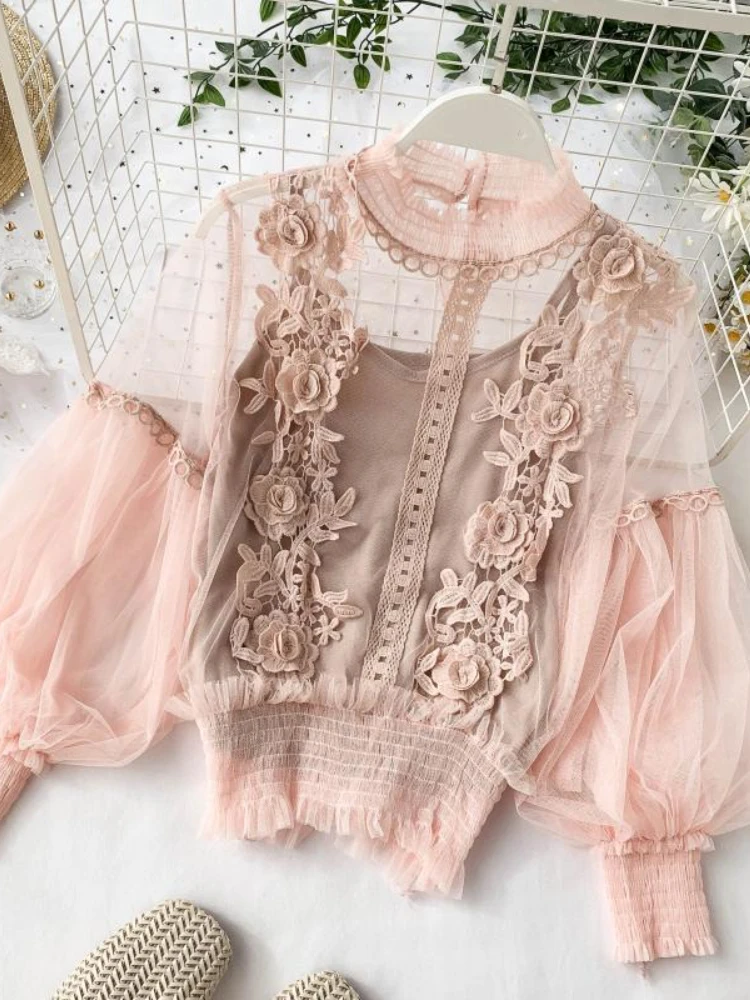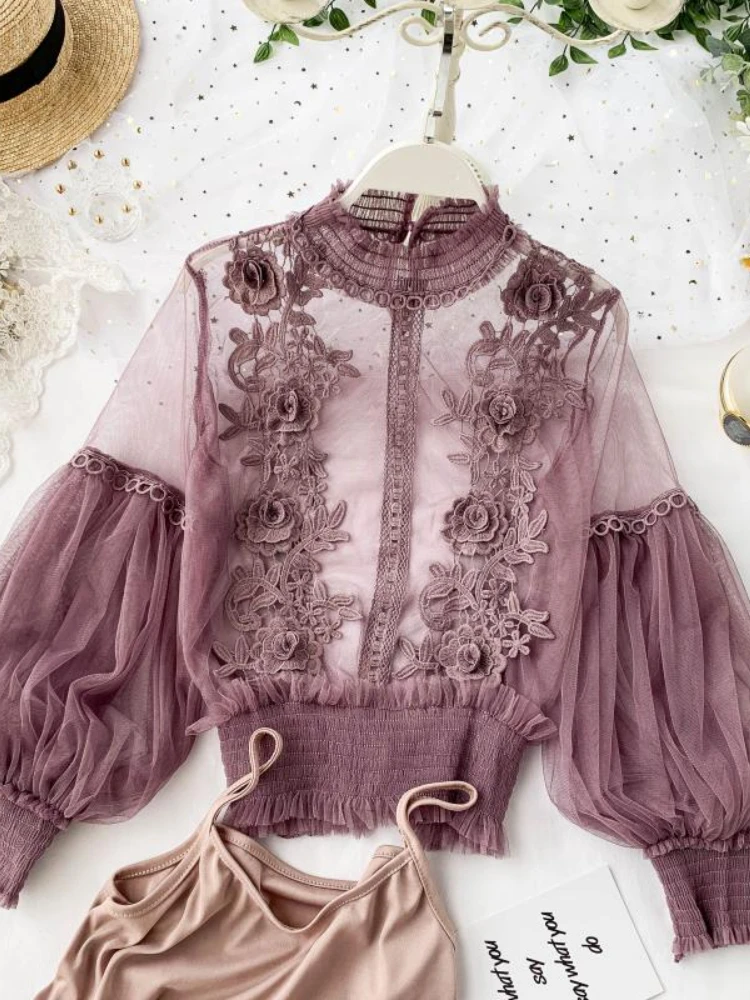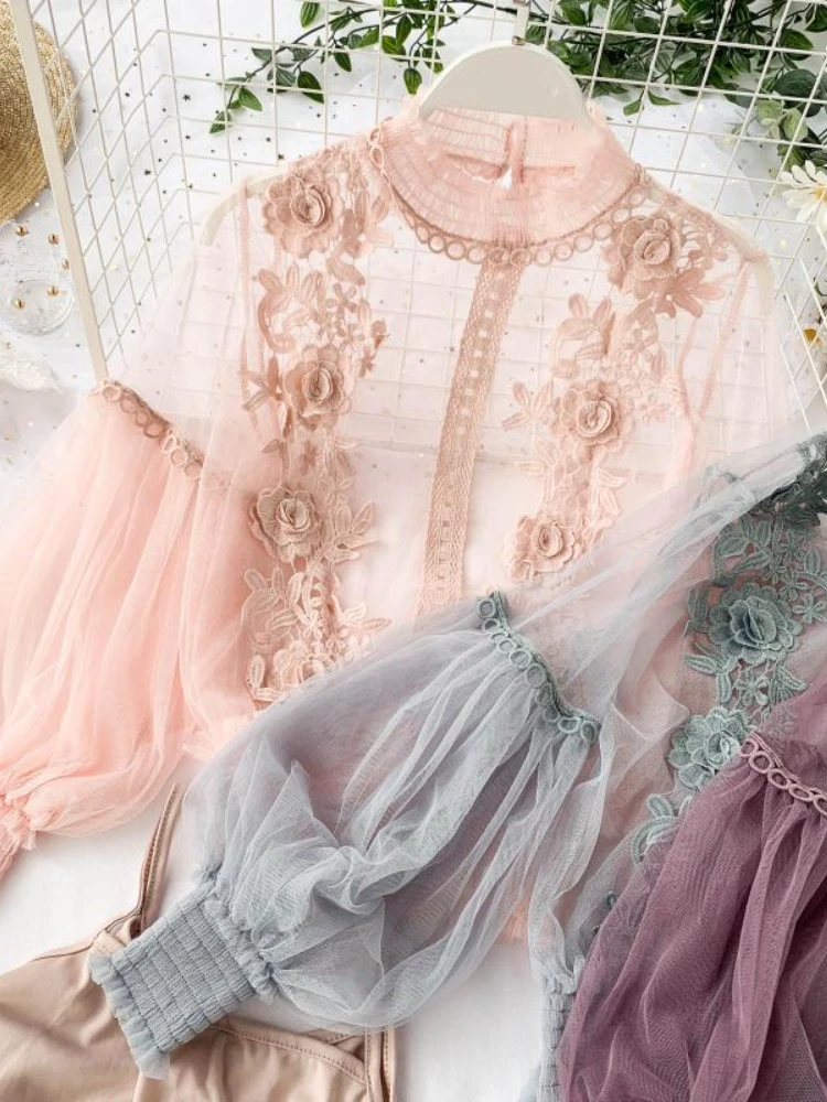 Осенние женские сетчатые топы, модная сексуальная Прозрачная кружевная блузка с рукавами-фонариками, 3D Цветочные блузки, элегантные топы, женские блузки, 2021
