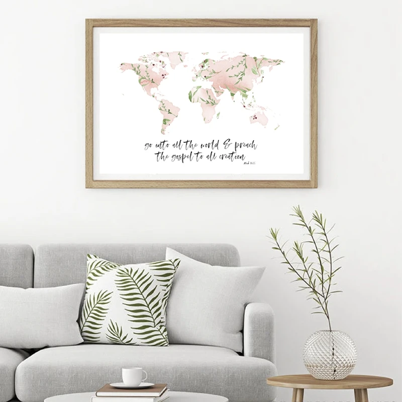 Карта мира, печать Марков 16:15, Библия, клетки, акварель, цветочное искусство, холст, живопись, Писание, христианский постер, домашнее настенное искусство, Декор