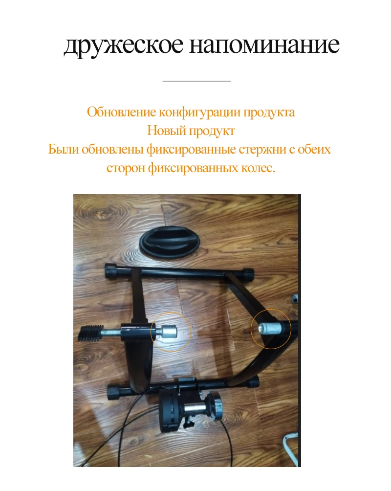 Товар получил. Пришла быстро, за 14 дней. Коробка была не сильно повреждена При распаковке товара, не было на правом затяжном винте вело станка хромированной короткой трубочки, которая должна быть на конце затяжного винта где прижимает колесо. Это место я показал на фото стрелкой. Как повлияет это на закрепление велосипеда, посмотрим на практике. Вся остальная конструкция вело тренажера совпадает по описанию. Дополнительный отзыв напишу позже. Продавец отвечает на все вопросы по товару. Ответственный подход к продаже товара. Рекомендую продавца. Спасибо большое.