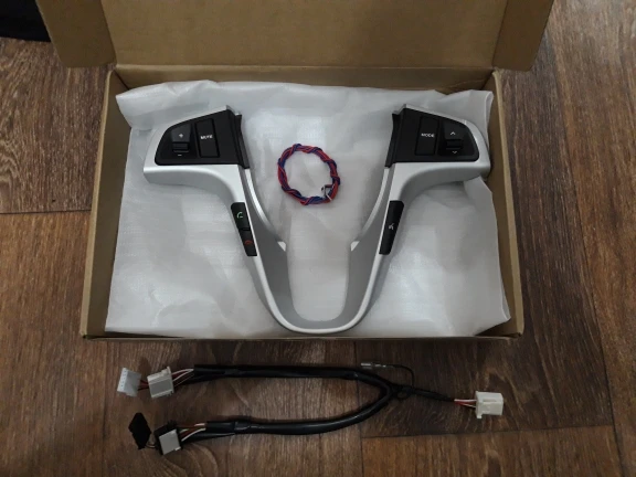 Заказ пришел достаточно быстро. Вид соответствует описанию. После установки обнаружился БРАК, джойстик переключения композиций ( радиостанций) работает только в одном направлении. Обучении джойстика в меню " обучение кнопок руля магнитолы" так же устанавливает для джойстика только одно действие. Происходит так : при нажатии джойстик вверх происходит переключение на следующую композицию или радиостанцию, при нажатии джойстика вниз переключение на предыдущую композицию или радиостанцию не происходит. Со вторым джойстиком - громкости все хорошо : при нажатии вверх "+" громкость увеличивается, при нажатии вниз "-" громкость уменьшается. В остальном все работает, кнопки светятся. Так же как и в предыдущих отзывах понадобилось доработать "напильником" - спилить по одной направляющей с каждой стороны, т.к. направляющие очень толстые и в отверстие на руле не входят.