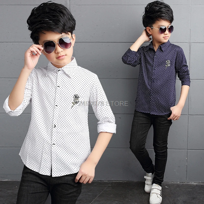Рубашка для мальчиков, весенняя, темно-синяя, в горошек, с длинным ...