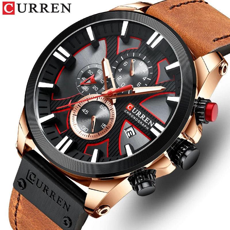 Часы CURREN Мужские наручные кварцевые, роскошные Брендовые спортивные с хронографом, с кожаным ремешком, с датой