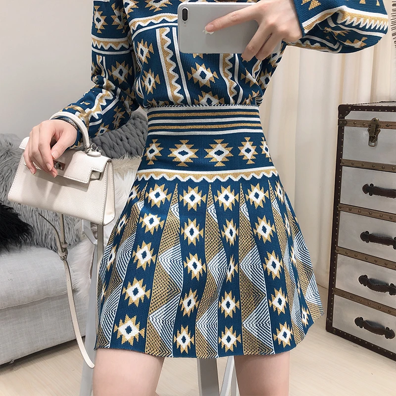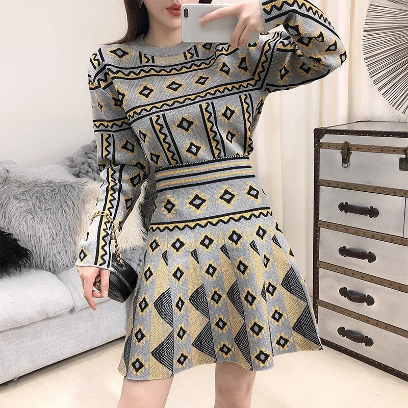 BLLOCUE 2019 строгие женские зимние элегантные жаккардовый вязаный комплект из 2 предметов, пуловер, свитер с длинными рукавами + юбка для девочек трапециевидной формы с Sui