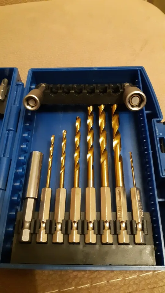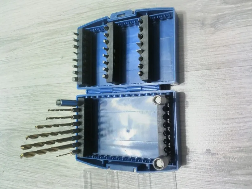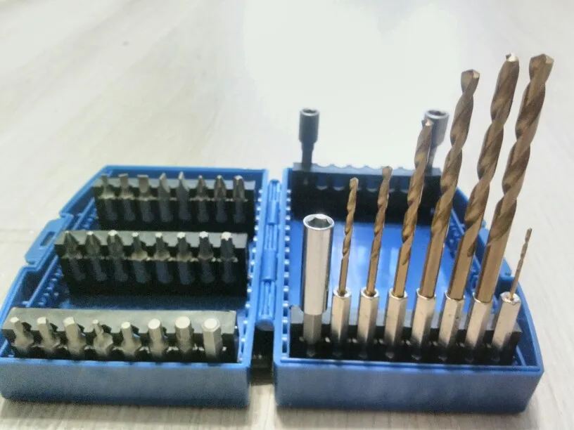 Доставка в Киев 70 дней. Сверла и биты на первый взгляд качественные, металл тяжёлый, матовый, хотя есть небольшие цапочки ржавчины. Снимаю звезду за коробку для хранения: вся какая-то поцарапанная, логотип нанесён на изоленту, а та уже наклеена на коробку, совсем несерьёзно.