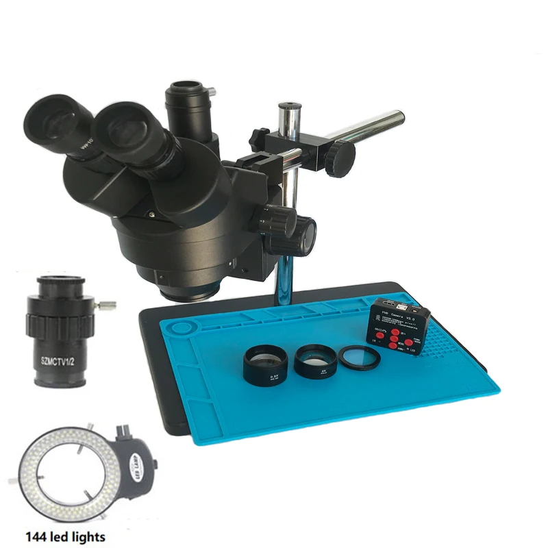 Посылка incluede: 1 х тринокулярная Стерео Зум-головка 1 x пара супер Widefield 10X окуляров 1x144-светодиодный кольцевой светильник с адаптером (12 В) 1 x настольная подставка 1 x фокусировки стеллаж для выставки товаров Адаптер с-креплением-1 шт. 1 пара защитных очков 1 x Пылезащитный чехол 1 x 0.5x объектив (для 3.5X -90X) 1 x 2.0x объектив (для 3.5X-90X)