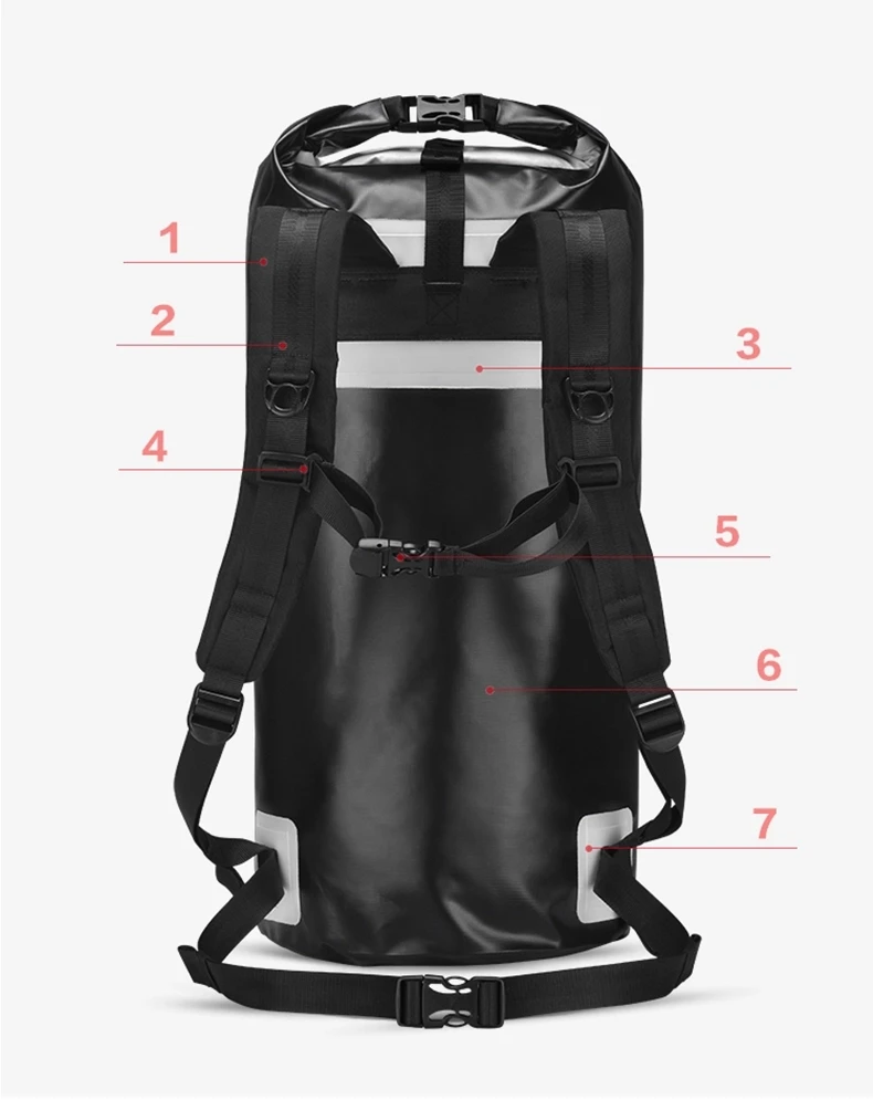 1. ABS крепеж 2. Черный 500D ПВХ ткань 3. Серебристая Толстая светоотражающая ткань 4. Уплотнительные застежки 5. Конструкция ручки 6. Многослойное армирование 7. Наружная молния 8. Высокочастотное давление 9. ПВХ сетчатая поверхность 10. Интерфейс закалки 11. Светоотражающая полоса