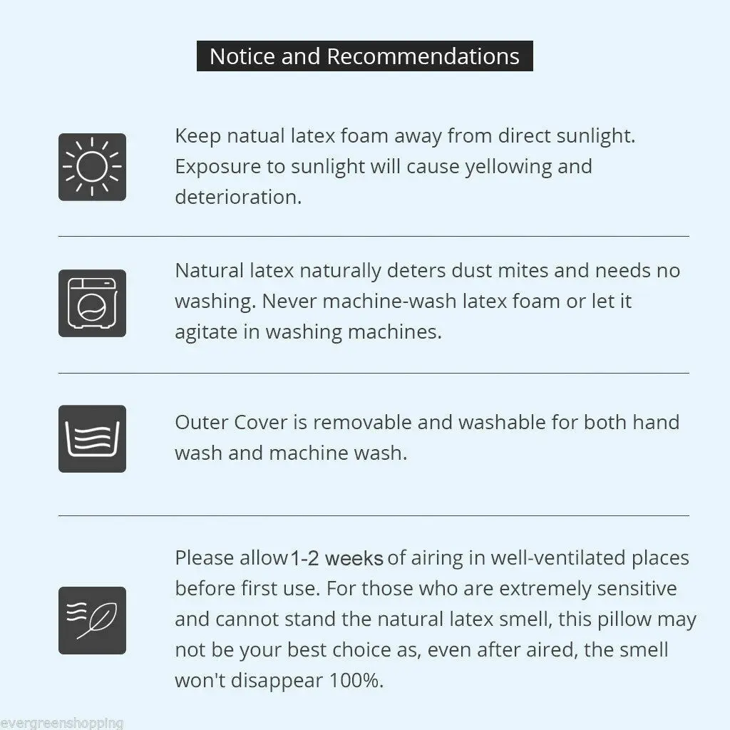 Инструкции по уходу Держите натуральную латексную пену вдали от прямых солнечных лучей. Воздействие солнечного света приведет к пожелтению и порче. Натуральный латекс естественным образом сдерживает пылевые клещи и не требует мытья. Не допускайте машинной стирки латексной пены и возбуждения в стиральных машинах. Обратите внимание Натуральный латекс имеет отчетливый запах. Когда вы получите новую латексную подушку, она может иметь легкий сладкий запах резины. Хотя в подушке нет ничего вредного, она допускает определенный запах, который люди могут заметить. Подавляющее большинство людей не будут беспокоить слабый, слегка сладкий запах натурального латекса, и некоторые цитируют это как ключевое преимущество при выборе подушки из натурального латекса. Для тех, кто чувствителен к запахам, рекомендуется перед первым использованием проводить 5-10 дней проветривания (без воздействия солнечного света) в хорошо проветриваемых местах на балконе. Запах ослабевает, но не полностью исчезнет. Для тех, кто очень чувствителен и не выдерживает естественного латекса, эта подушка может быть не лучшим выбором.
