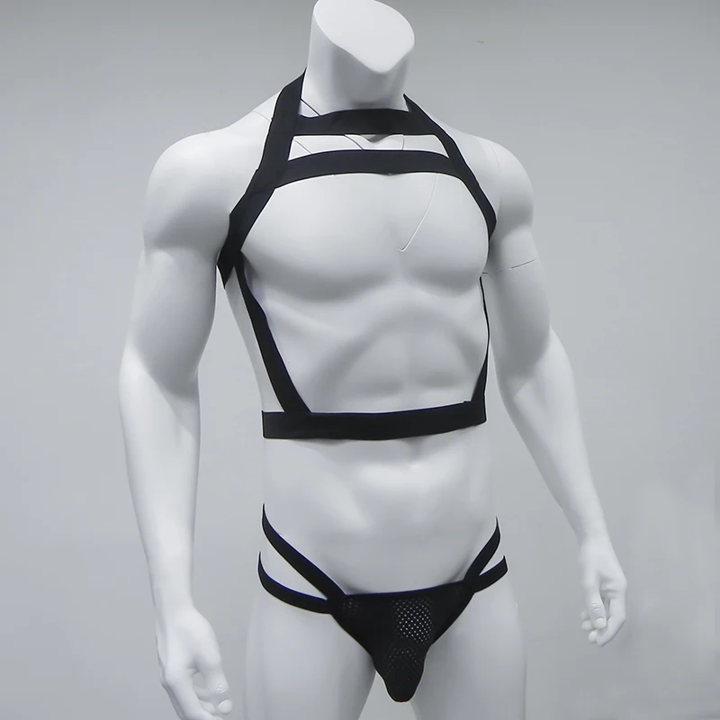 Лидер продаж, мужской костюм с лямкой на шее, бондаж для взрослых, эластичный нагрудный ремень на плечах, ажурное нижнее белье, Комплект трусиков-танга, бандаж