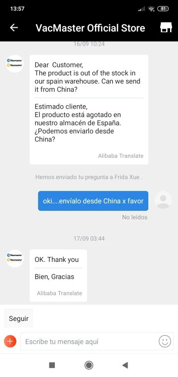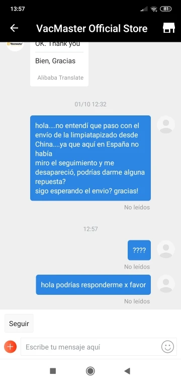 Я заказал 27 декабря, он прибыл 31 декабря из Испании, большое спасибо, Испания, я попробовал пылесос, это супер хорошо, он работает очень хорошо, я уже попробовал его 31 декабря, спасибо, тысяча раз, это очень хорошее качество