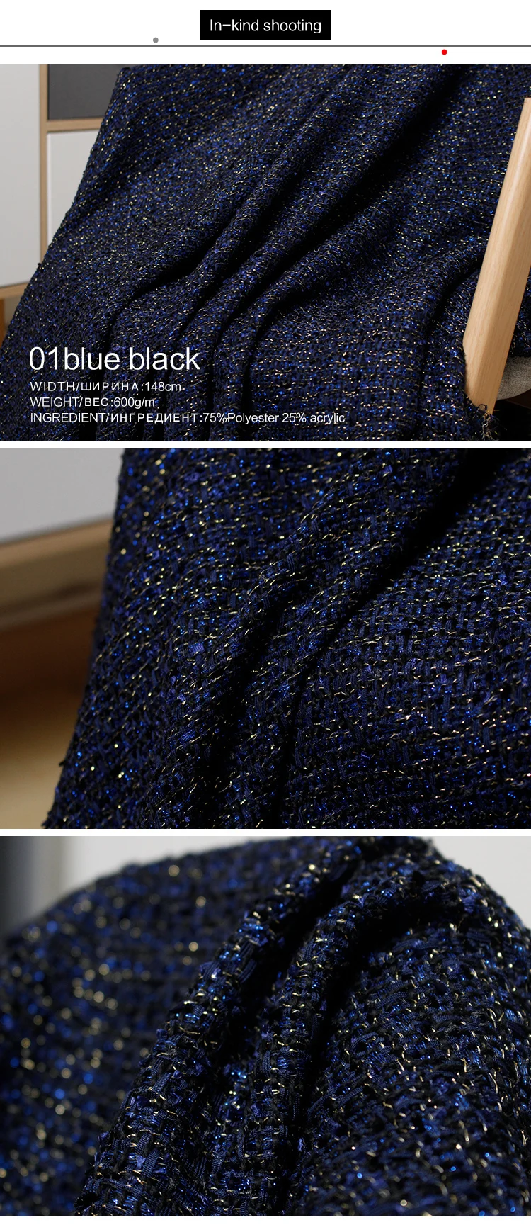 Ткань темно-синяя черная жаккардовая твидовая шерстяная ткань станд...