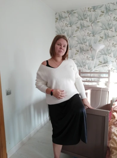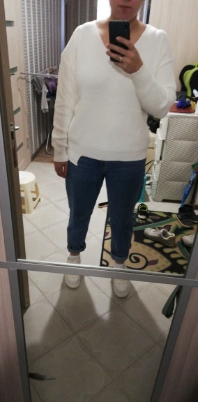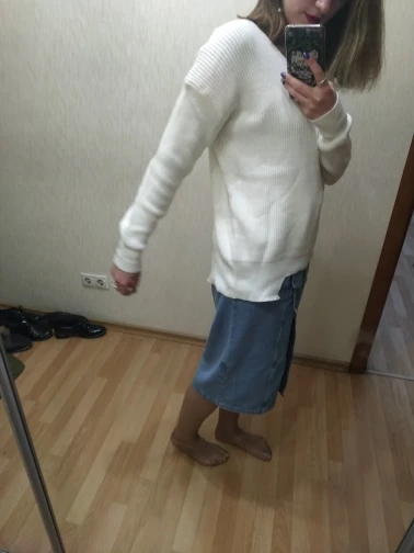 Свитер понравился, цвет белоснежный, сидит хорошо, мягкий, удобный, рукава длинные, как я люблю, вырез великоват, была одна затяжка, но не критично, буду носить. Подойдёт и на 52 размер, у меня 46.
