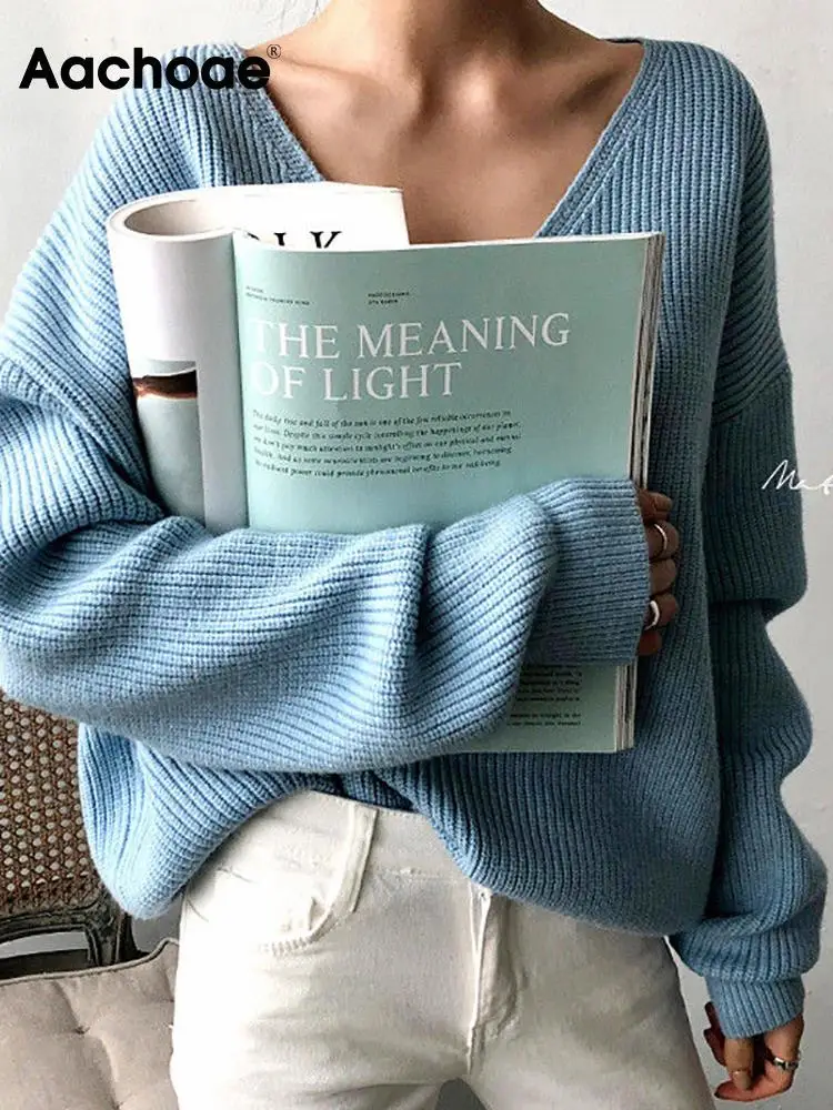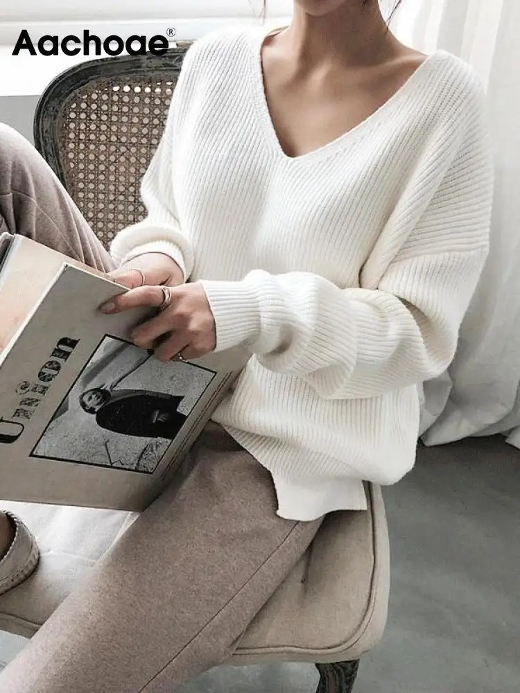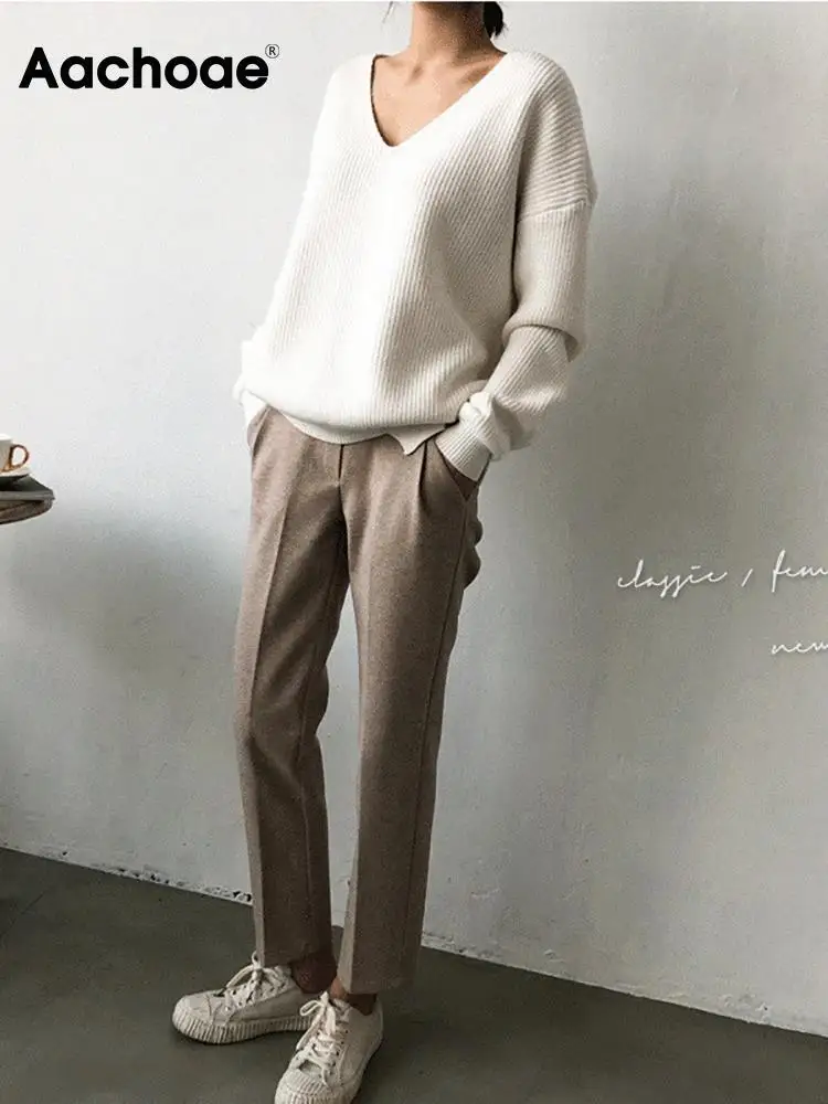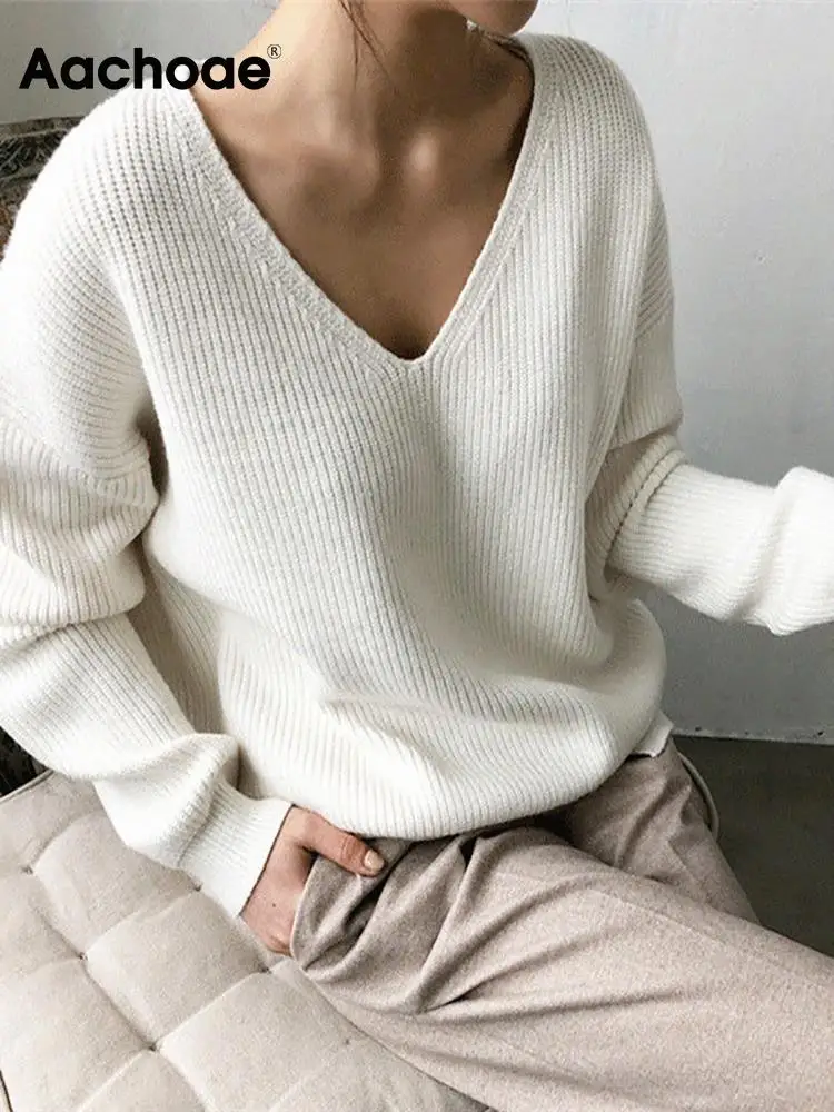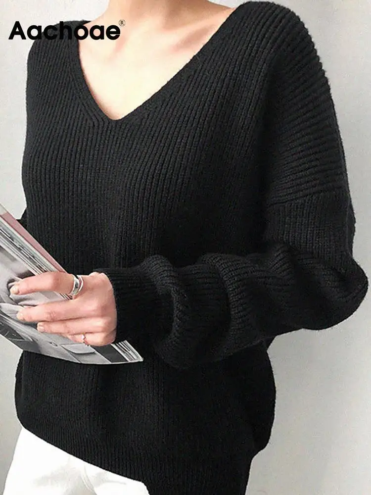 Женские свитера Aachoae сезона осень-зима 2022, повседневный Женский пуловер с V-образным вырезом, Однотонный свитер, Свободный вязаный кашемировый топ с длинным рукавом