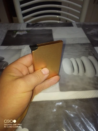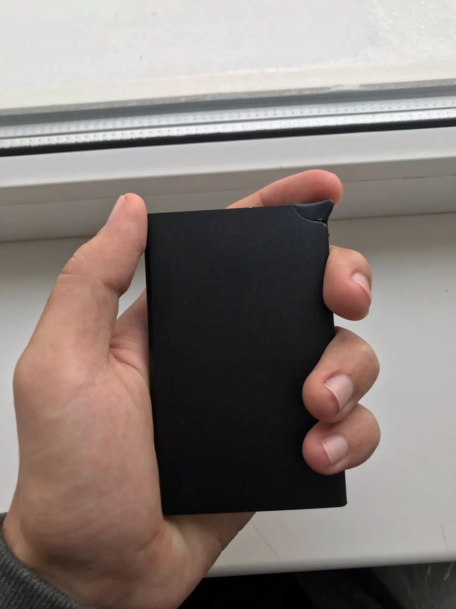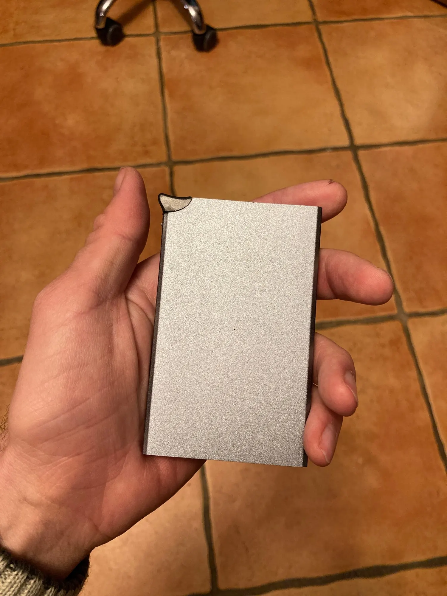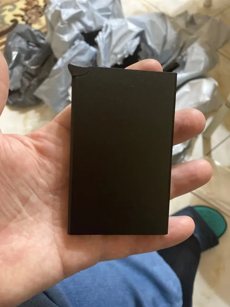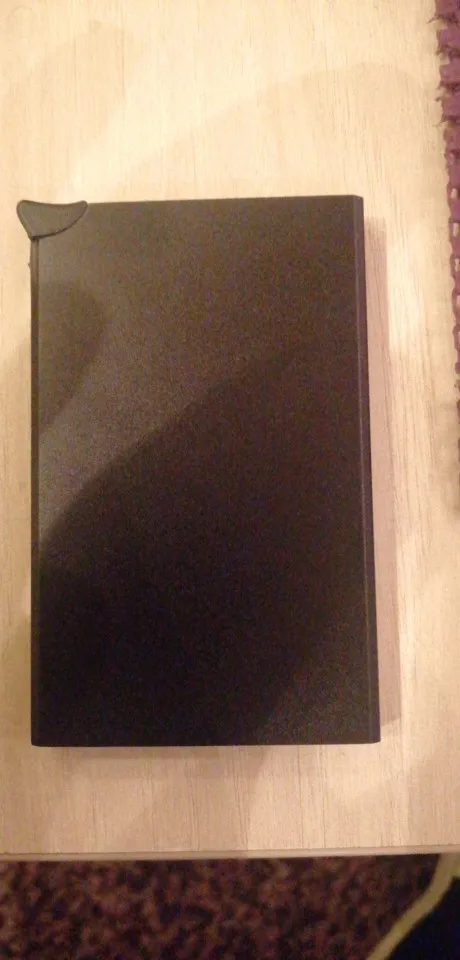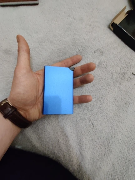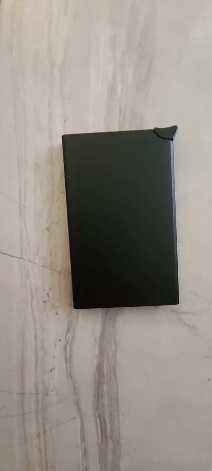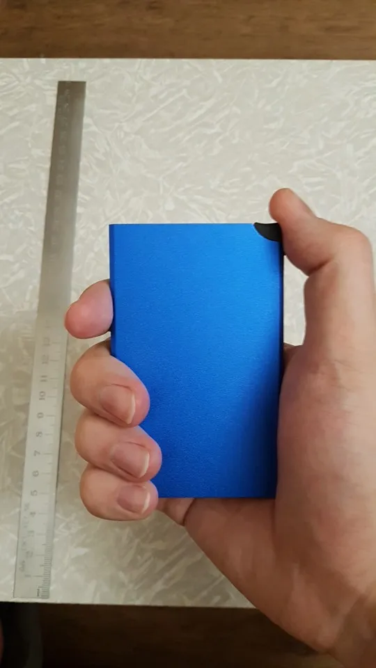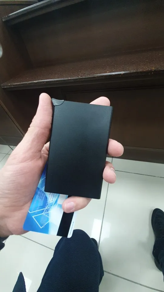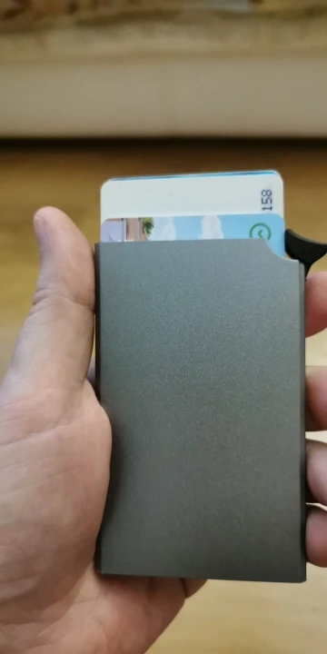 По первым ощущениям не слишком удобная штука. Рука у меня не маленькая, но одной рукой открывать крайне неудобно -- в руку врезается угол кардхолдера. Сам он металлический из-за чего скользит. На первом фото то, как его не надо держать -- не откроете. На втором то, в каком положении сможете открыть. И не наклоняйте его при открытии -- карточки вылетят вперед