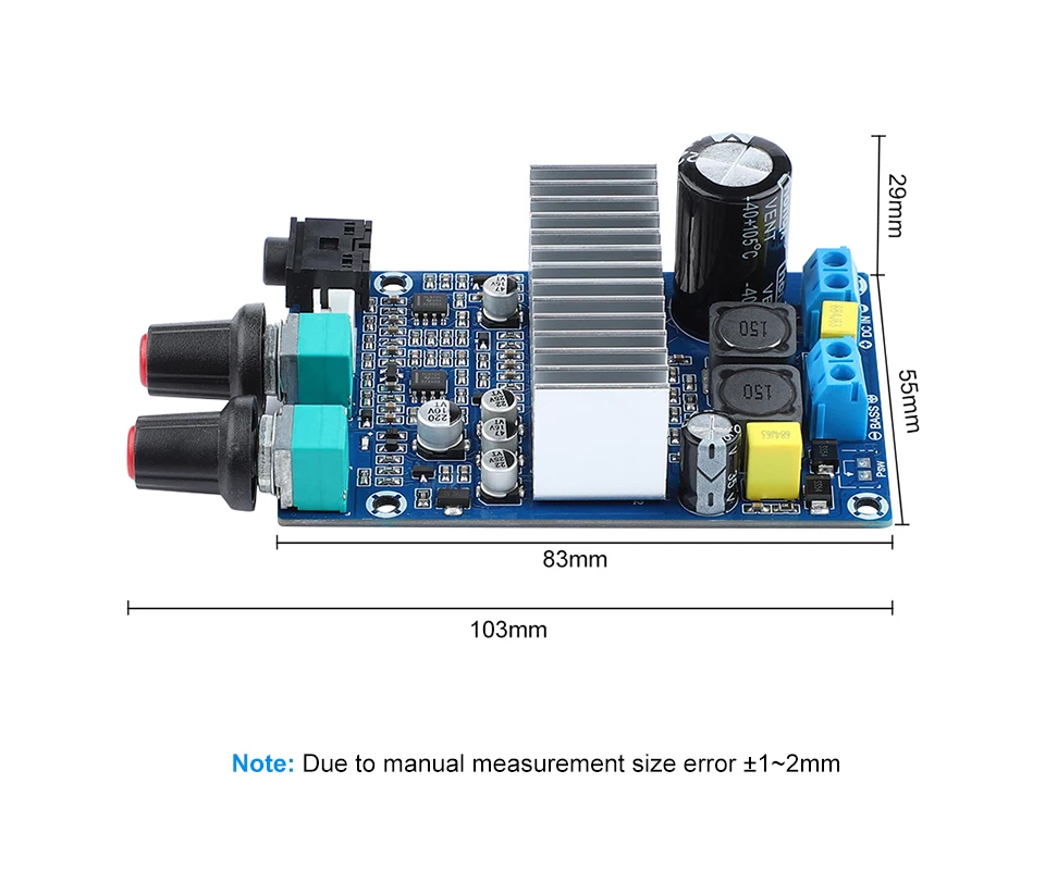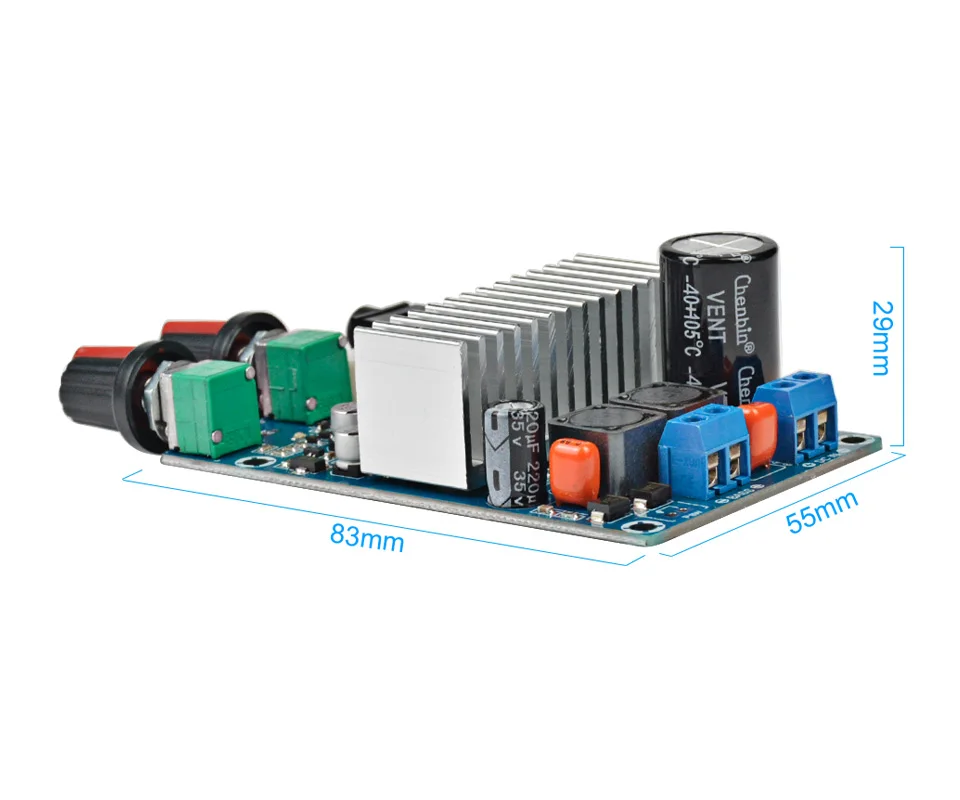 Размер платы: 55X83X29 мм (без учета выступа потенциометра 15 мм)Диапазон рабочего напряжения: DC9-25V (ток 2-3A или более, если мощность больше, рекомендуется быть 19-24V4A или более)Диапазон воспроизводимых частот: Вход: 20 Гц-20 кГцВыход: 20 гц-180 ГцЧувствительность аудиовхода: 500 мВСопротивление сабвуфера: 2-8 Ом