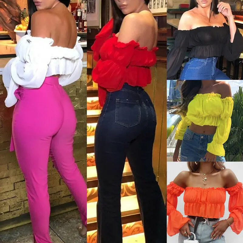 Женская шифоновая блузка с открытыми плечами, повседневная укороченная блузка с открытыми плечами, Клубная одежда, 5 цветов, лето-осень