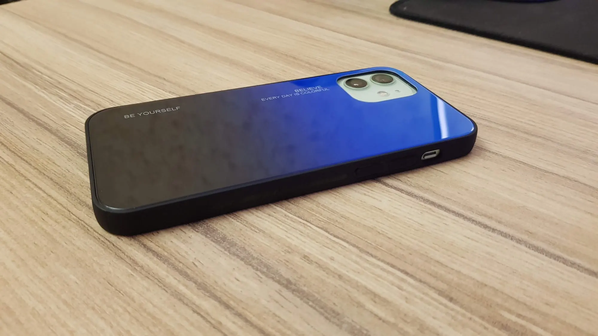 На сайте продавца он более голубой. У меня более фиолетовый. Искать по дому сложнее будет. Отпечатки остаются на ура. Но так же легко стираются. И да, это не стекло, а пластик под стекло. Кант чёрный.