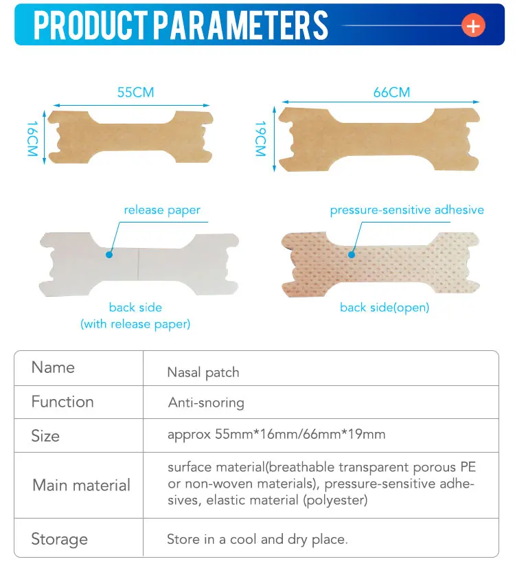 Название: носовые накладки Функция: Защита от храпа Размер: прибл. 55 мм * 16 мм/66 мм * 19 мм Основной материал: поверхностный материал (дышащие прозрачные пористые ПЭ или нетканые материалы), чувствительные к давлению клеи, эластичный материал (полиэстер) и наклейка на заднюю часть. Хранение: Хранить в прохладном и сухом месте.